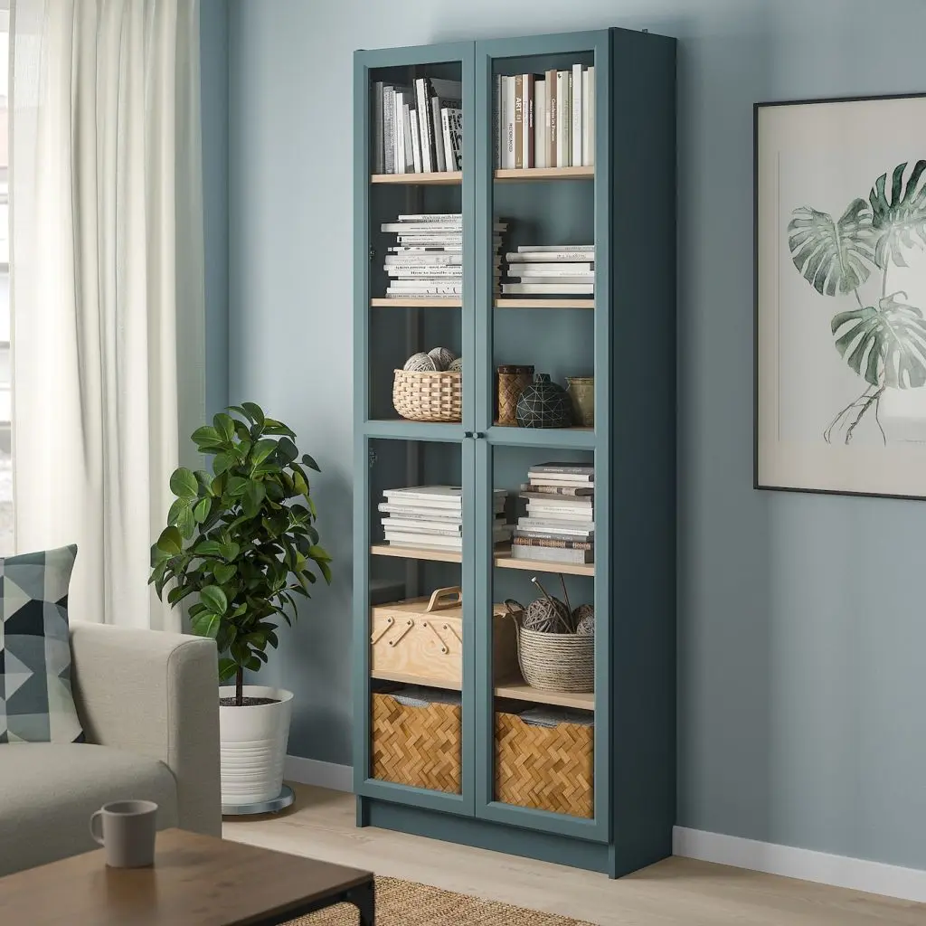 Шкаф книжный со стеклянными дверьми, серо-бирюзовый/дубовый шпон, беленый, 80x30x202 см 15999,00 р.