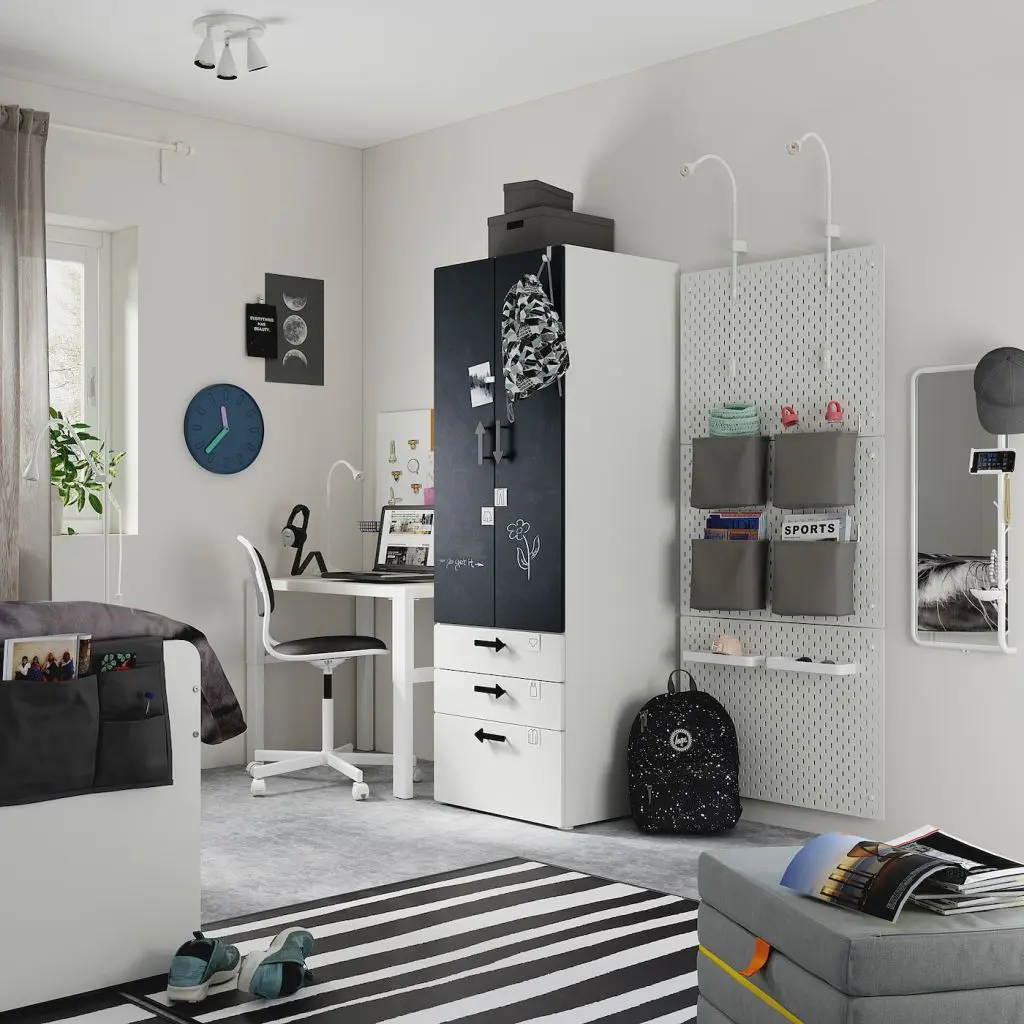Ребенок может пользоваться этим гардеробом много лет, т. к. глубина шкафа позволяет развешивать в нем одежду на плечиках стандартного размера, а высоту его внутренних элементов можно менять по мере роста ребенка.Двери с петлями для плавного закрывания всегда закрываются бесшумно — даже в разгар жаркого спора.ВНИМАНИЕ! ОПАСНОСТЬ ОПРОКИДЫВАНИЯ! Незакрепленная мебель может опрокинуться. Эту мебель необходимо крепить к стене с помощью прилагаемого крепежа для предотвращения опрокидывания.1 платяная штанга, 2 полки, 1 проволочная корзина, 2 крючка для платяной штанги ХЭЛПА и 2 крючка/зажима ЛЭТТХЕТ прилагаются.Для разных стен требуются различные крепежные приспособления. Подберите подходящие для ваших стен шурупы, дюбели, саморезы и т. п. (не прилагаются).Чтобы вещи было легче находить, можно дополнить окошками для этикетки ХЭНГИГ (продаются отдельно)Ручки продаются отдельно.