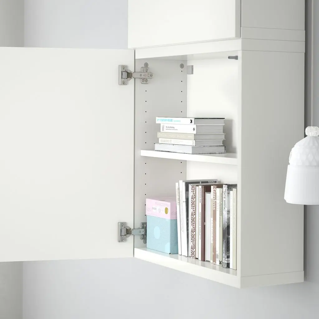 Компактные навесные шкафы позволяют эффективно задействовать стену под хранение вещей.Конструкция петель позволяет отрегулировать и выровнять дверцу по вертикали и по горизонтали. Вы можете использовать нажимной механизм или устройство для плавного закрывания. В первом варианте для открывания дверцы достаточно слегка нажать на нее. А во втором – гарантировано плавное и бесшумное закрывание.Дверь можно установить справа или слева.Предусмотрите минимум 5 см между верхней панелью каркаса и потолком, чтобы каркас можно было установить на накладную шину.Для разных стен требуются различные крепежные приспособления. Подберите подходящие для ваших стен шурупы, дюбели, саморезы и т. п. (не прилагаются).Максимальная нагрузка на закрепленный на стене каркас зависит от материала стены.Если вы выберете функцию плавного закрывания, рекомендуем дополнить фасады ручками, чтобы открывать ящики/шкафы было удобнее.2 регулируемые по высоте полки прилагаются.Накладная шина БЕСТО для фиксации к стене прилагается.