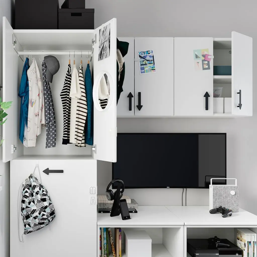 Такое решение дает вам много места для хранения и освобождает пространство для экрана или доски для записей на стене.Ваш ребенок сможет много лет пользоваться этим решением для хранения, так как по мере изменения потребностей вы можете менять внутреннее оснащение.В нижней части выдвижного модуля можно хранить все, что нужно быстро убирать с глаз долой.Благодаря крючкам изнутри и снаружи ребенку будет гораздо проще развешивать одежду, рюкзаки и другие вещи, которые обычно просто валяются на полу.Двери с петлями для плавного закрывания всегда закрываются бесшумно — даже в разгар жаркого спора.ВНИМАНИЕ! ОПАСНОСТЬ ОПРОКИДЫВАНИЯ! Незакрепленная мебель может опрокинуться. Эту мебель необходимо крепить к стене с помощью прилагаемого крепежа для предотвращения опрокидывания.Для разных стен требуются различные крепежные приспособления. Подберите подходящие для ваших стен шурупы, дюбели, саморезы и т. п. (не прилагаются).Можно дополнить ручками.Ручки продаются отдельно.