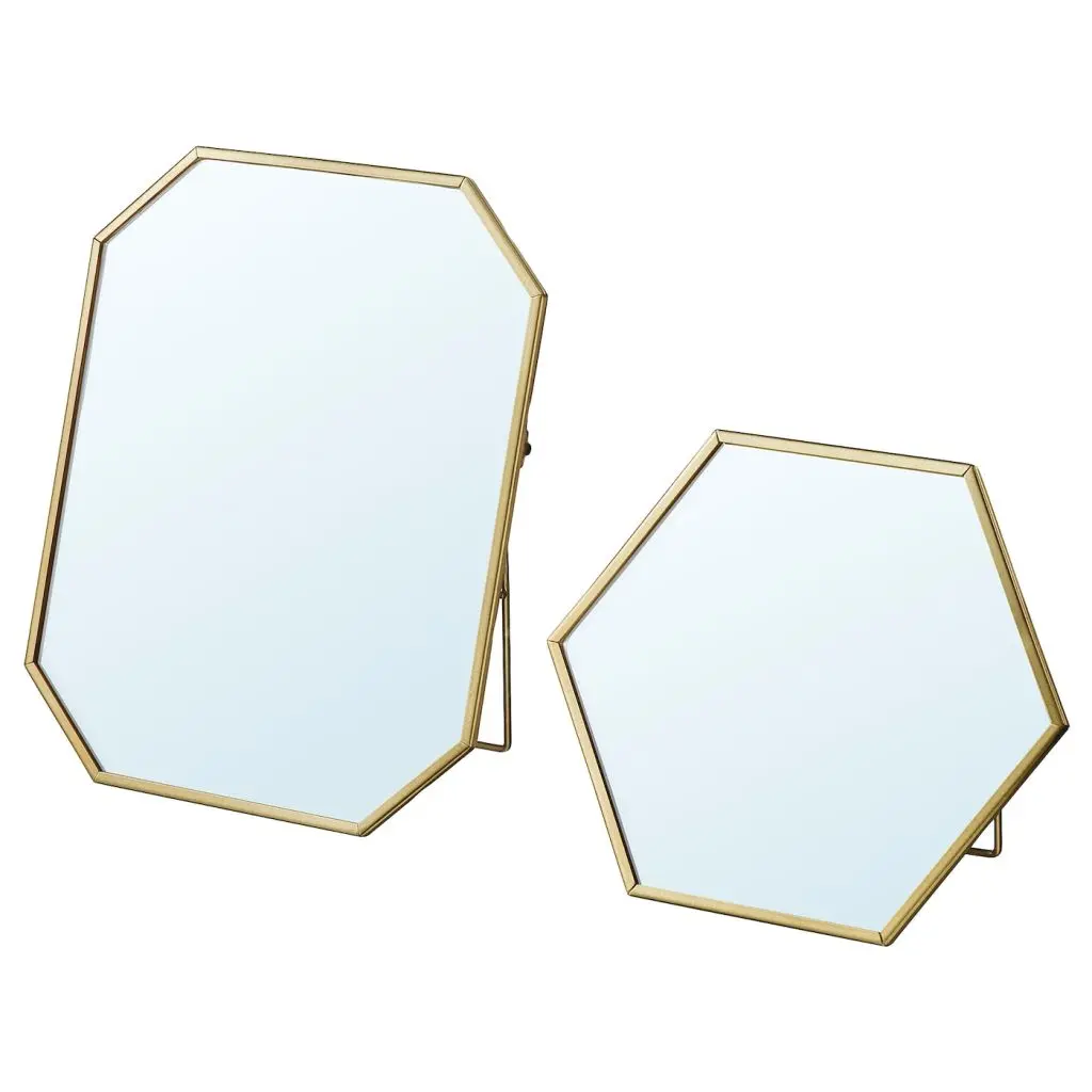 Можно повесить или поставить.Специальная пленка защитит от осколков, если стекло разобьется.Металлическая цепочка и подставка прилагаются. Раму можно повесить и поставить.В набор входит: 1 зеркало (ширина 20 см, высота 25 см) и 1 зеркало (ширина 20 см, высота 17 см).Дизайнер