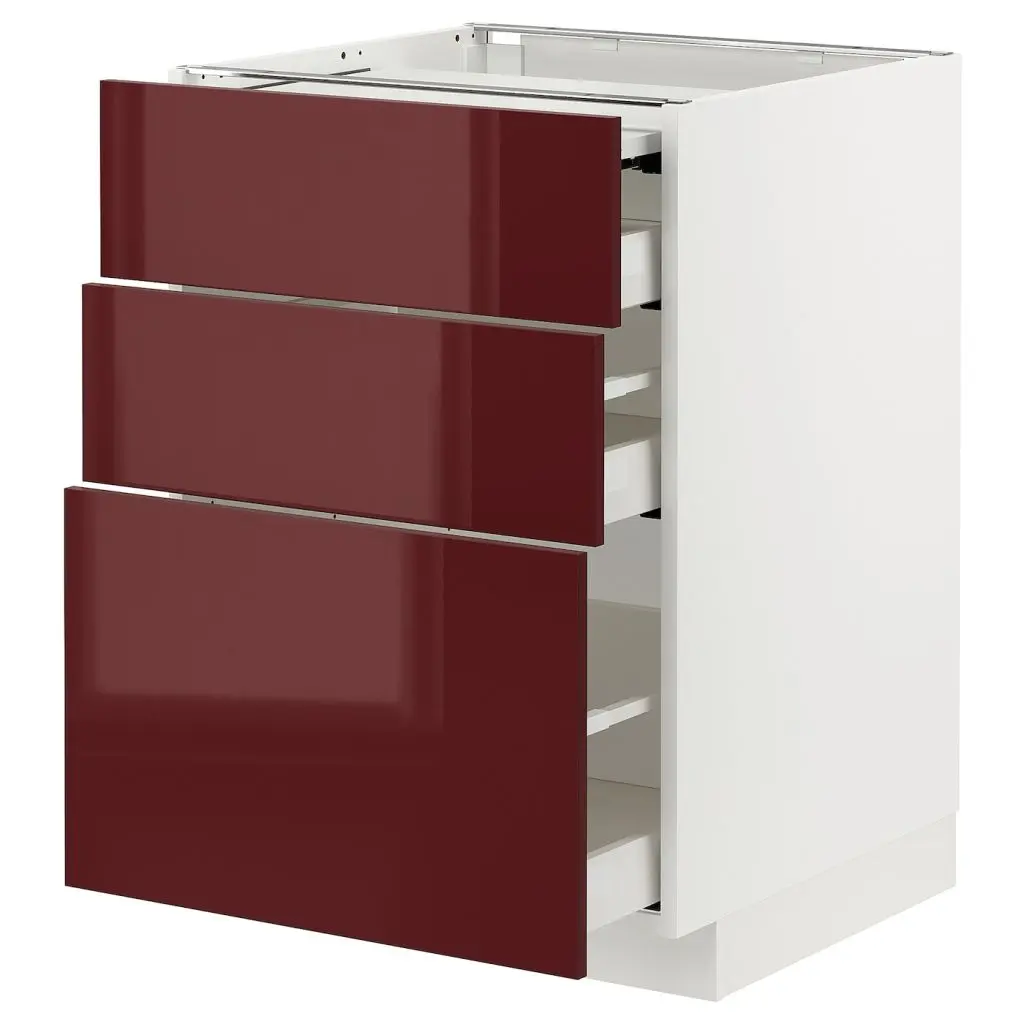 Код кухонного шкафа ME/MA 148Благодаря доводчику ящики закрываются плавно, мягко и бесшумно.Ящики выдвигаются полностью, что обеспечивает удобный обзор и доступ к содержимому.Ящики с плавным ходом и стопором.Самозакрывающиеся ящики.Каркас имеет устойчивую конструкцию благодаря стенкам из ДСП толщиной 18 мм.Для разных стен требуются различные крепежные приспособления. Подберите подходящие для ваших стен шурупы, дюбели, саморезы и т. п. (не прилагаются).Ножки и цоколи продаются отдельно.Можно дополнить ручкой.Дизайнер