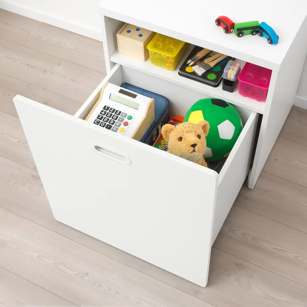 За фасадом скрываются вместительный ящик для игрушек, снабженный колесиками, и полка для книг. Если вам нужно еще больше места для хранения, расширьте комбинацию дополнительными каркасами серии СТУВА.