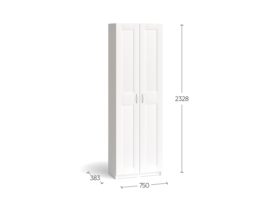 Шкаф МАКС для одежды двухдверный, 750х380х2330, цвет Белый. Укомлектован двумя полками . Изготовлен из кашированного ДСП толщиной 18 мм. Крепится к стене. Гарантийный срок для жилых помещений 24 месяца, для общественных помещений — 18 месяцев.