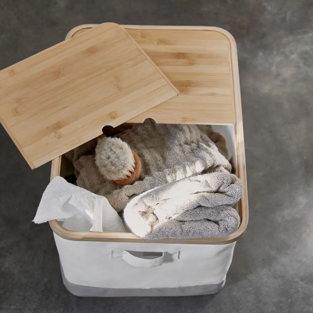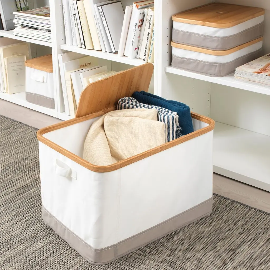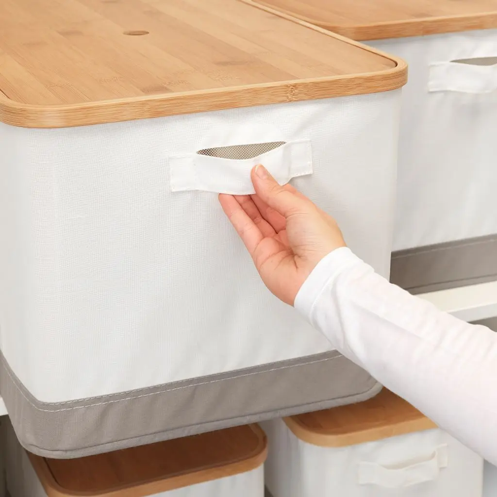 Используйте для внутреннего оснащения гардероба или для отрытого хранения. Мягкие коробки из ткани с бамбуковыми крышками представлены в нескольких вариантах размеров.