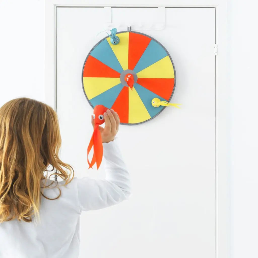 Это отличная игра для маленьких детей. Дротики на липучке безопасны, а с помощью двусторонней мишени ребенок может изучать цвета и числа.