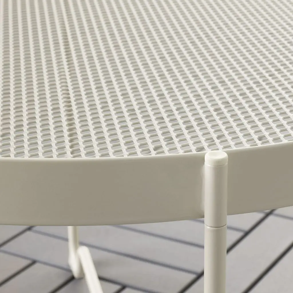 Прочный и простой в уходе столик.Столешница из металлической сетки делает дизайн легким и воздушным. А дождевая вода стекает через сетку, не скапливаясь на столешнице.Благодаря бортику столик удобно переносить.Дизайнер