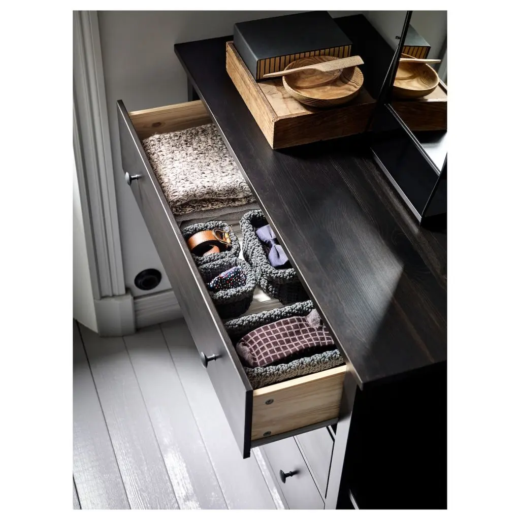 Ваш дом должен быть абсолютно безопасен для всей семьи. Именно поэтому крепеж безопасности для фиксации комода к стене прилагается.Массив дерева – прочный натуральный материал.Чтобы ящики не выпадали при открывании, они оснащены специальным стопором.ВНИМАНИЕ! ОПАСНОСТЬ ОПРОКИДЫВАНИЯ! Незакрепленная мебель может опрокинуться. Эту мебель необходимо крепить к стене с помощью прилагаемого крепежа для предотвращения опрокидывания.Для различных материалов стен требуются различные крепежные средства. Используйте крепежные средства, подходящие для материала стен в вашем доме.В маленький ящик можно положить примерно 10 пар брюк или 20 футболок.Большой ящик вмещает около 15 пар брюк или 30 футболок в сложенном виде.Дизайнер