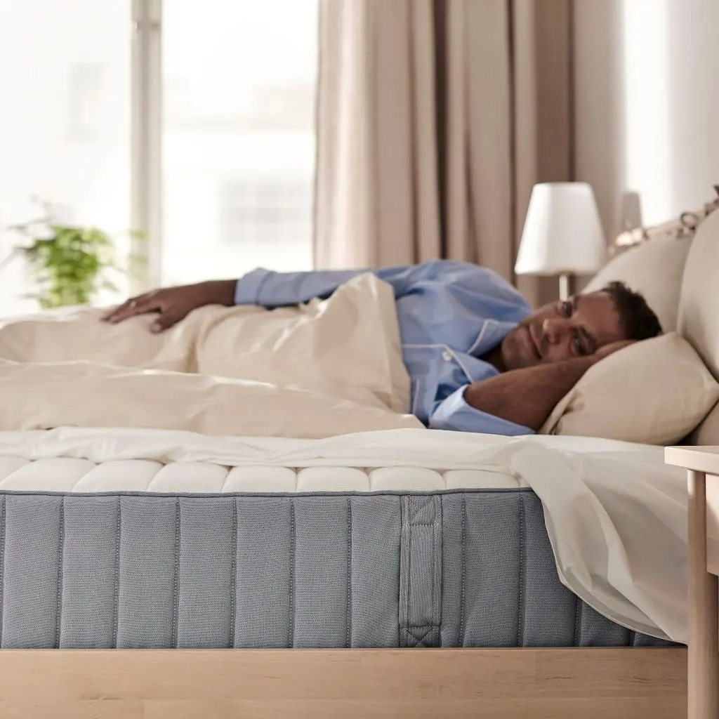 Жесткий матрас высотой 24 см с независимыми пружинами карманного типа. Вес тела равномерно распределяется по зонам комфорта, что обеспечивает мягкую поддержку в области бедер и плеч. Толстый слой пенополиуретана повышает комфорт.