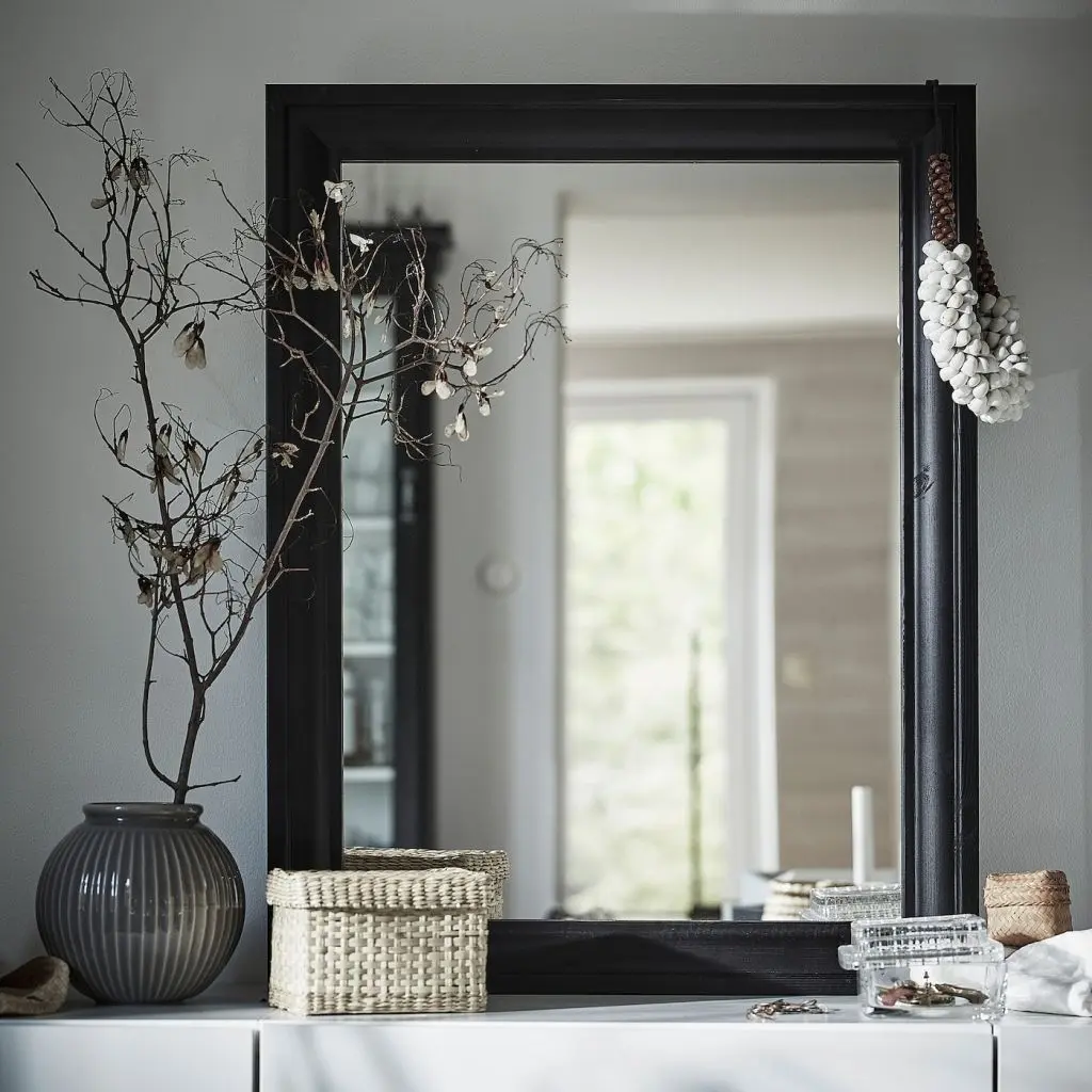 Классическое зеркало в профилированной раме. Его можно повесить как вертикально, так и горизонтально — в зависимости от ваших предпочтений и дизайна интерьера. Прекрасно сочетается с мебелью серии ХЕМНЭС.