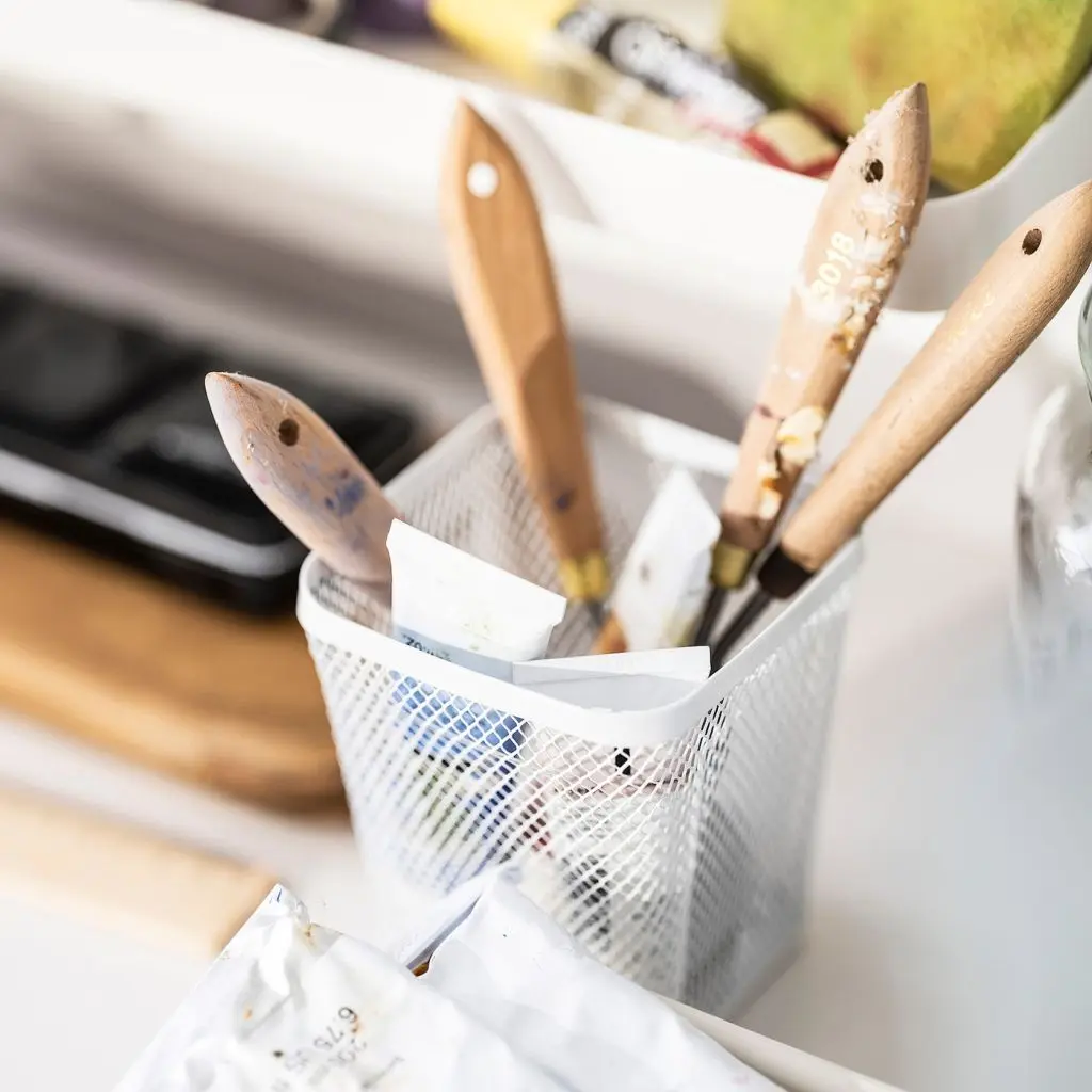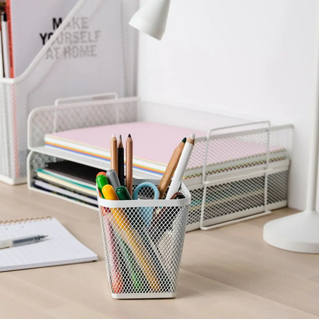 Мы назвали этот товар из металлической сетки стаканом для ручек, но его можно использовать не только для канцелярских принадлежностей. Положите в него косметику, заколки для волос, аксессуары для хобби и другие мелочи, который должны быть под рукой.