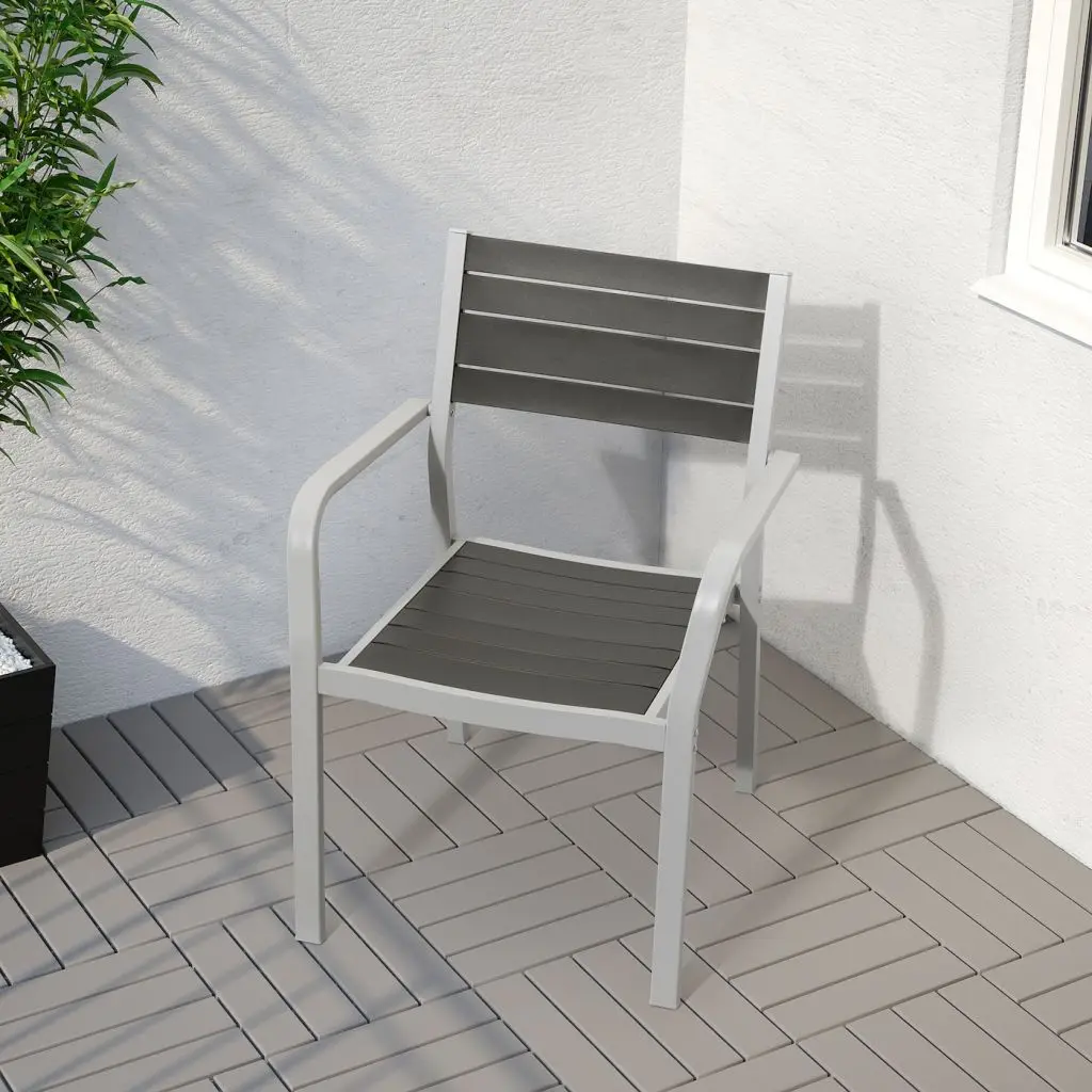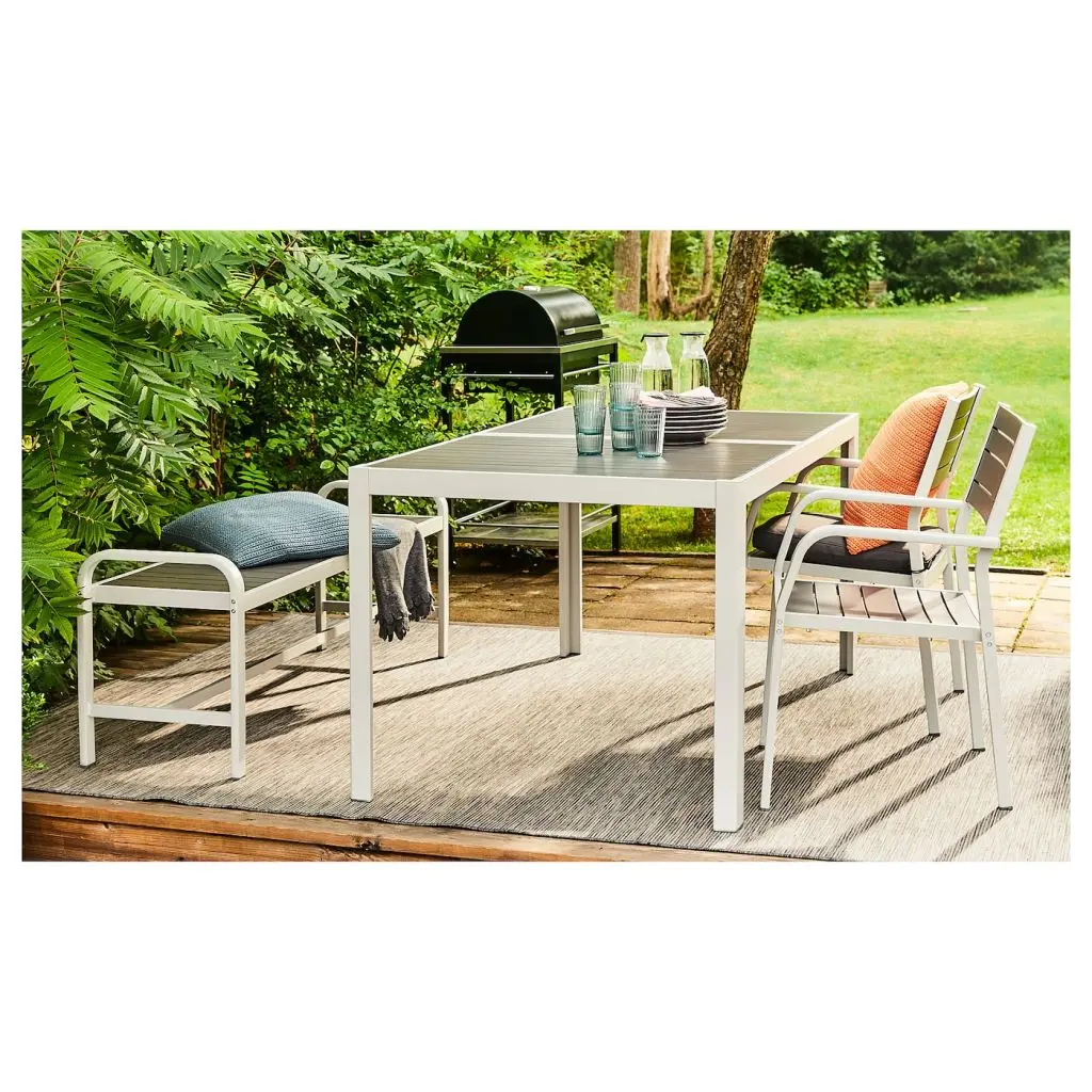 До 6 стульев можно ставить друг на друга, что позволяет экономить место при храненииОтверстие в центре столешницы позволяет установить зонт от солнца.Материалы, из которых изготовлена эта садовая мебель, не требуют ухода.Легко поддерживать в чистоте – достаточно протереть влажной тканью.Прочная, легкая и простая в уходе мебель изготовлена из жаропрочного алюминия.Можно дополнить подушкой на стул ФРЁСЁН/ДУВХОЛЬМЕН 44×44 см.Можно дополнить подушкой на стул ФРЁСЁН/ДУВХОЛЬМЕН 35 см, 3 шт.Рекомендовано для использования на улице.Дизайнер