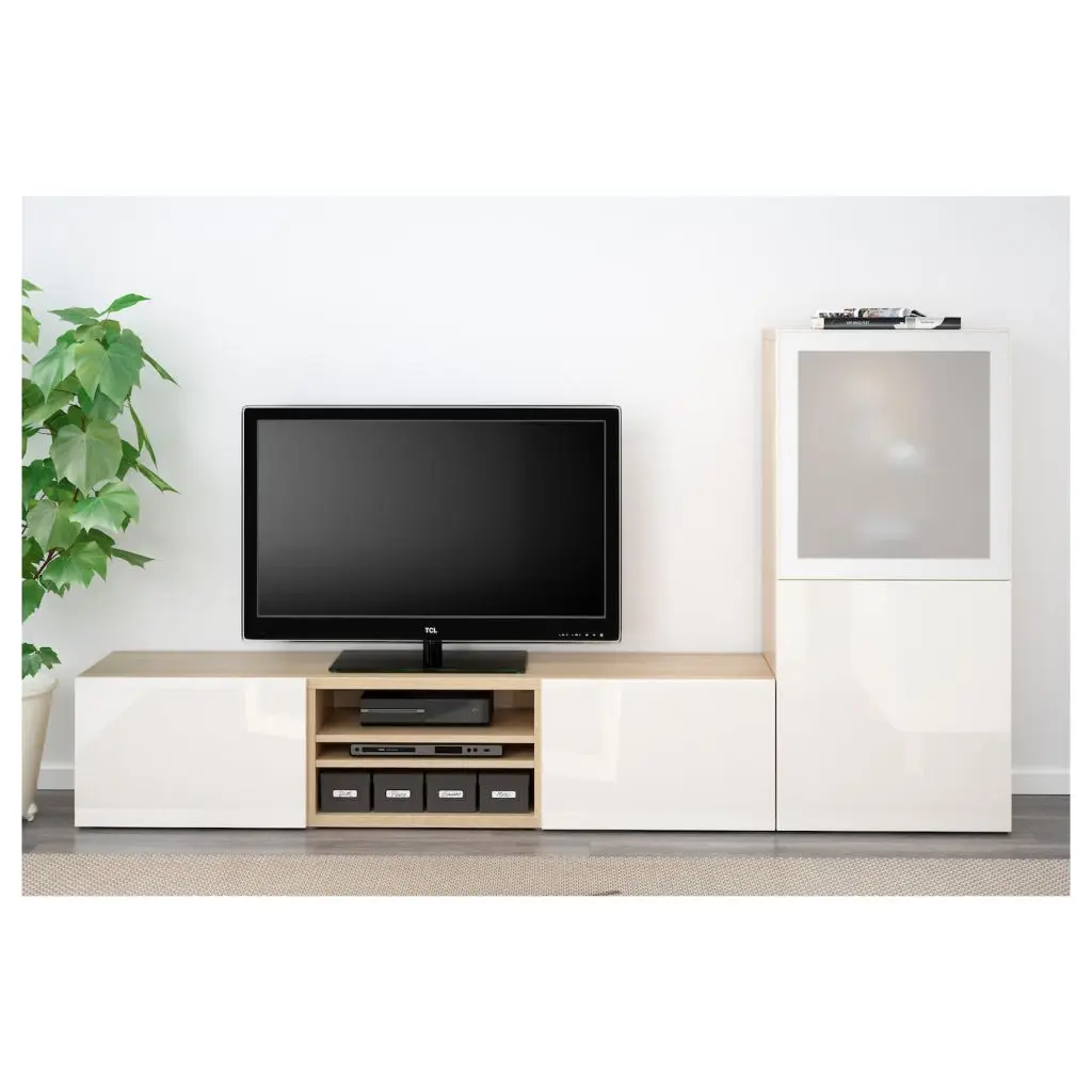 Шкаф для ТВ, комбин/стеклян дверцы, под беленый дуб, Сельсвикен глянцевый/белый матовое стекло, 240x42x129 см