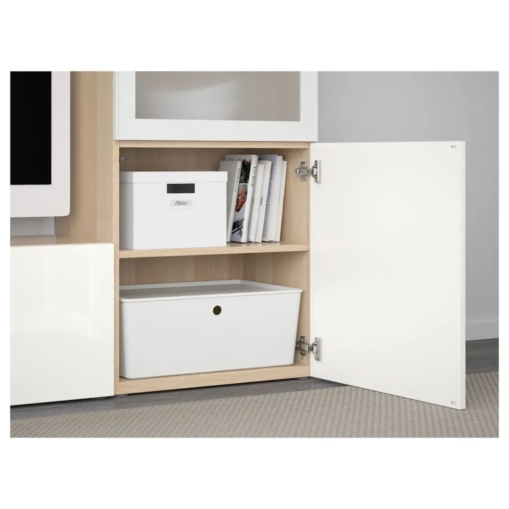 Благодаря доводчикам ящики закрываются плавно и бесшумно.Благодаря нескольким отверстиям на задней панели тумбы под ТВ провода от телевизора и других устройств всегда будут под рукой, но не на виду.Два ящика и полки за дверцами обеспечат достаточно места для хранения.Съемные полки позволяют регулировать пространство.Специальное отверстие в верхней панели обеспечит удобное и компактное размещение проводов.Эту мебель необходимо крепить к стене с помощью прилагаемого стенного крепежа.Будьте осторожны при обращении с закаленным стеклом! Из-за поврежденных краев и царапин на поверхности стекло может внезапно разбиться.Макс. нагрузка на верхнюю панель этой тумбы под ТВ: 50 кг.Для разных стен требуются различные крепежные приспособления. Подберите подходящие для ваших стен шурупы, дюбели, саморезы и т. п. (не прилагаются).Максимальная нагрузка на закрепленный на стене модуль зависит от материала стены.Внутренние элементы для организации хранения в модулях БЕСТО продаются отдельно.Если вы выберете функцию плавного закрывания, рекомендуем дополнить фасады ручками, чтобы открывать ящики/шкафы было удобнее.Дизайнер