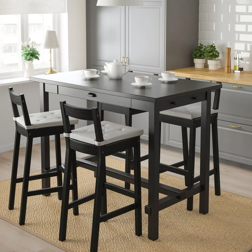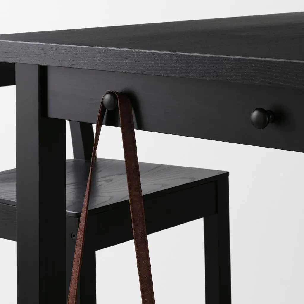 Столешница барного стол НОРДВИКЕН расположена на комфортной высоте. Ящик и два крючка по бокам позволяют разместить все необходимое под рукой. Прекрасное решение дополнить стол барными стульями этой серии.