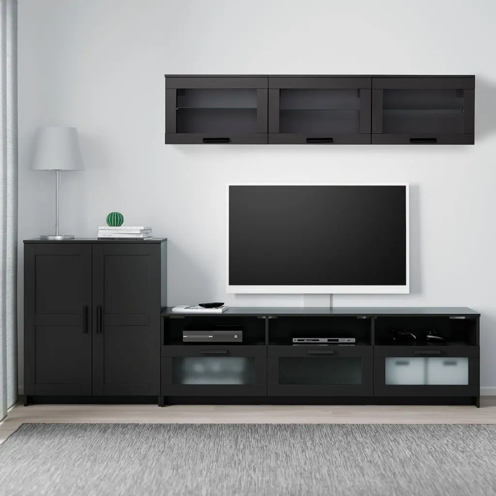 Эта комбинация для ТВ предоставит достаточно места для хранения, чтоб в вашей гостиной царил идеальный порядок.Глухие дверцы защитят содержимое от пыли.Отверстия для проводов на задней панели. Провода не на виду, но всегда под рукой.Ящики с плавным ходом и стопором.Эту мебель необходимо крепить к стене с помощью прилагаемого стенного крепежа.Для разных стен требуются различные крепежные приспособления. Подберите подходящие для ваших стен шурупы, дюбели, саморезы и т. п. (не прилагаются).Комбинируется с другой мебелью серии БРИМНЭС.Дизайнер