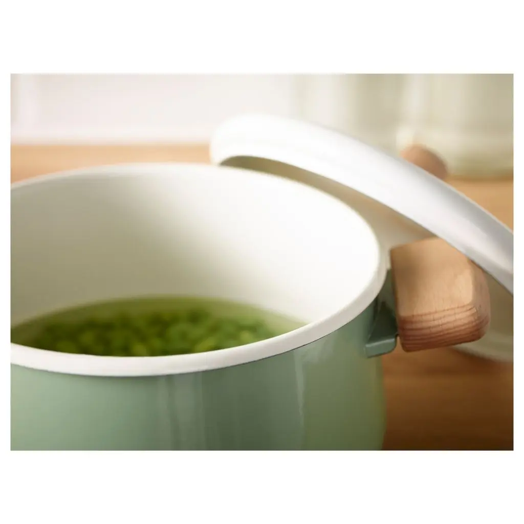 Эта кастрюля из эмалированной стали белого и зеленого цветов снабжена прочными деревянными ручками. Прекрасно подойдет для приготовления картофеля, пасты и супов и будет прекрасно смотреться на столе.