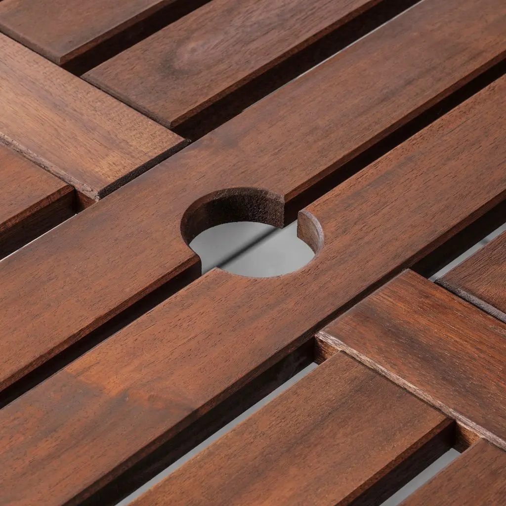 Отверстие в центре столешницы позволяет установить зонт от солнца.Мебель обработана полупрозрачной морилкой в несколько слоев. Это повышает ее прочность и подчеркивает выразительность натуральной фактуры дерева.На 4-8 человек.Рекомендовано для использования на улице.Для повторной обработки используйте морилку, продается отдельно.Дизайнер