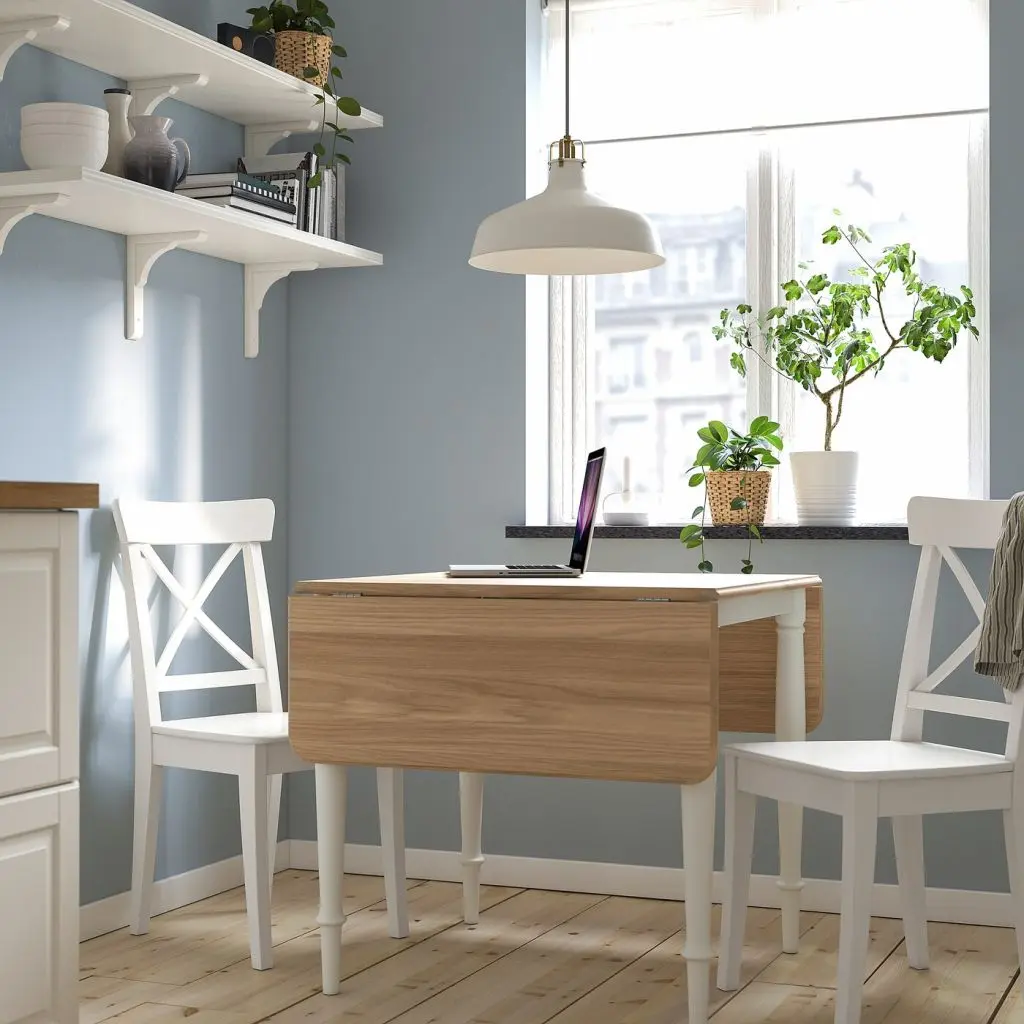 Этот стол с откидными полами идеален для маленькой кухни, а может дополнить и более просторный интерьер. Есть 3 варианта: сложить обе полы, поднять одну или сразу обе. Детали (например, резные ножки) придают столу традиционного дизайна особое очарование.