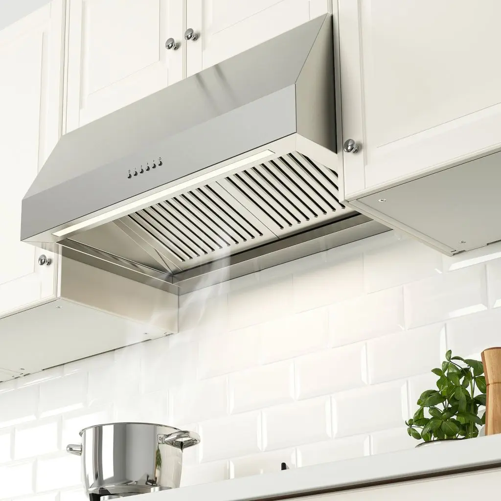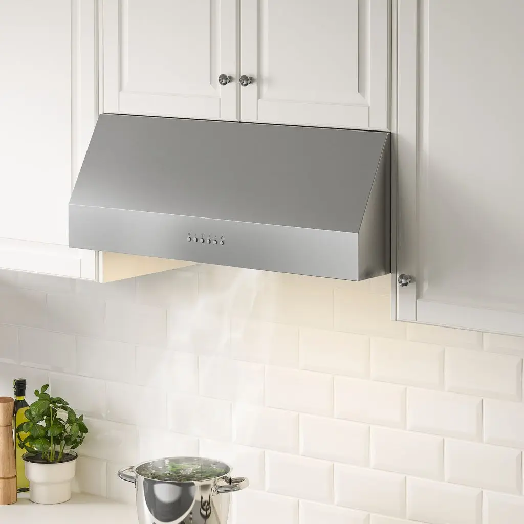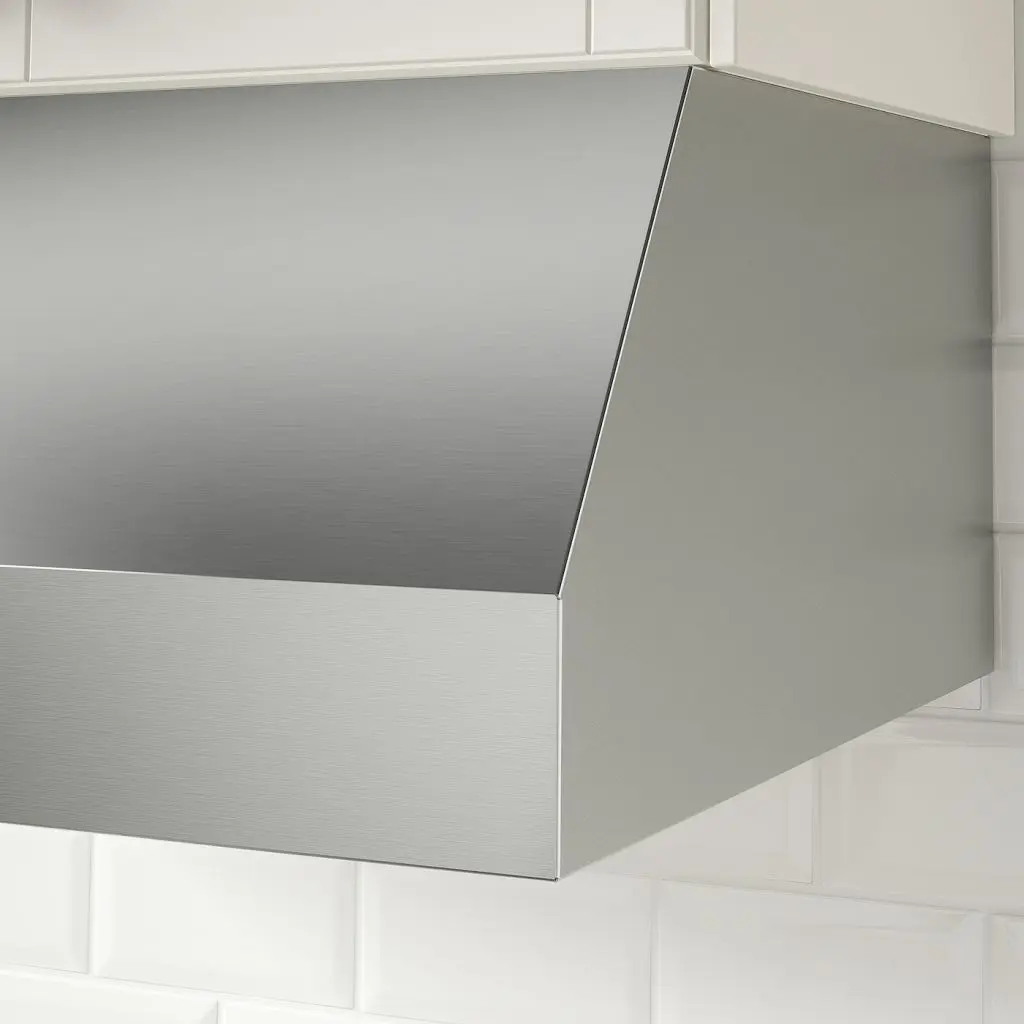 Мощная вытяжка со светодиодной подсветкой, внешний вид которой вы выбираете сами. Ее можно установить внутрь навесного шкафа или просто повесить на стену, чтобы была видна труба. В любом случае ее стальная отделка станет элементом стиля кухни.