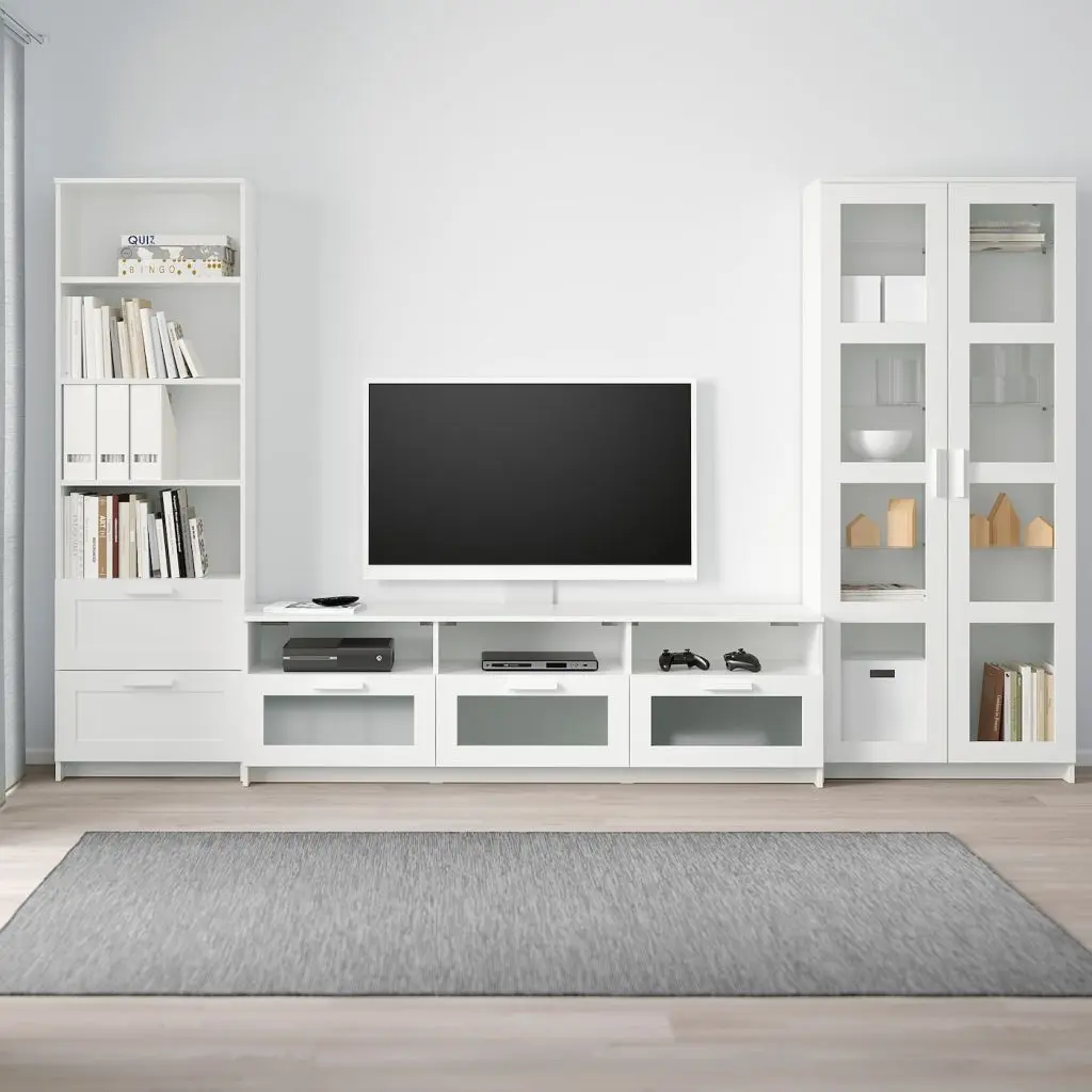Эта комбинация для ТВ предоставит достаточно места для хранения, чтоб в вашей гостиной царил идеальный порядок.Отверстия для проводов на задней панели. Провода не на виду, но всегда под рукой.Ящики с плавным ходом и стопором.Съемные полки позволяют регулировать внутреннее пространство в соответствии с потребностями хранения.Дополните шкаф-витрину подсветкой, которая не только обеспечит освещение содержимого, но и создаст в комнате уютную располагающую атмосферу.Шкаф-витрина позволяет продемонстрировать ваши бокалы и любимые безделушки, защищая их от пыли.Эту мебель необходимо крепить к стене с помощью прилагаемого стенного крепежа.Будьте осторожны при обращении со стеклом! Из-за поврежденных краев и царапин на поверхности стекло может внезапно треснуть и/или разбиться. Избегайте ударов сбоку, там стекло наиболее уязвимо.Для разных стен требуются различные крепежные приспособления. Подберите подходящие для ваших стен шурупы, дюбели, саморезы и т. п. (не прилагаются).Комбинируется с другой мебелью серии БРИМНЭС.Дизайнер