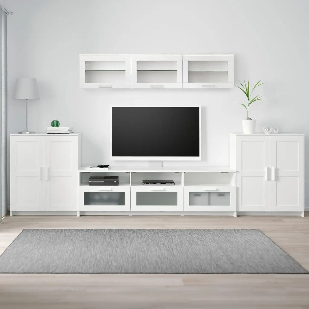 Эта комбинация для ТВ предоставит достаточно места для хранения, чтоб в вашей гостиной царил идеальный порядок.Глухие дверцы защитят содержимое от пыли.Отверстия для проводов на задней панели. Провода не на виду, но всегда под рукой.Ящики с плавным ходом и стопором.Эту мебель необходимо крепить к стене с помощью прилагаемого стенного крепежа.Для разных стен требуются различные крепежные приспособления. Подберите подходящие для ваших стен шурупы, дюбели, саморезы и т. п. (не прилагаются).Комбинируется с другой мебелью серии БРИМНЭС.Дизайнер