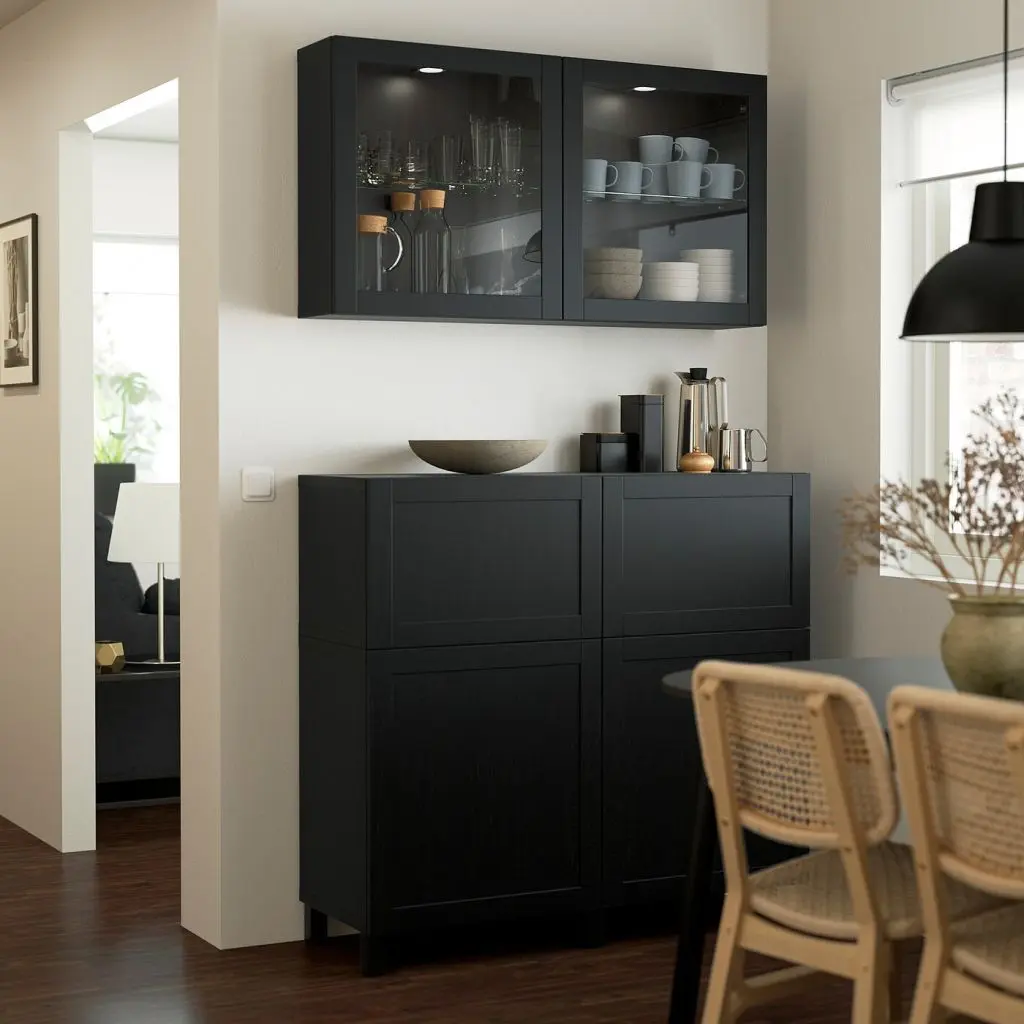 Стеклянные дверцы позволяют продемонстрировать содержимое шкафа, защищая его от пыли.Ящики со встроенным нажимным механизмом открываются легким нажатием.Конструкция петель позволяет отрегулировать и выровнять дверцу по вертикали и по горизонтали. Съемные полки позволяют регулировать пространство.Компактные навесные шкафы позволяют эффективно задействовать стену под хранение вещей.Два ящика и полки за дверцами обеспечат достаточно места для хранения.Организуйте и оптимизируйте систему для хранения БЕСТО, используя подходящие коробки и вставки.Эту мебель необходимо крепить к стене с помощью прилагаемого стенного крепежа.Будьте осторожны при обращении с закаленным стеклом! Из-за поврежденных краев и царапин на поверхности стекло может внезапно разбиться.Для разных стен требуются различные крепежные приспособления. Подберите подходящие для ваших стен шурупы, дюбели, саморезы и т. п. (не прилагаются).Для функционирования нажимного механизма необходимо пространство между каркасом и фронтальной панелью ящика, чтобы ящик открывался нажатием. Небольшой зазор необходим для обеспечения этой функции и не является недостатком товара.