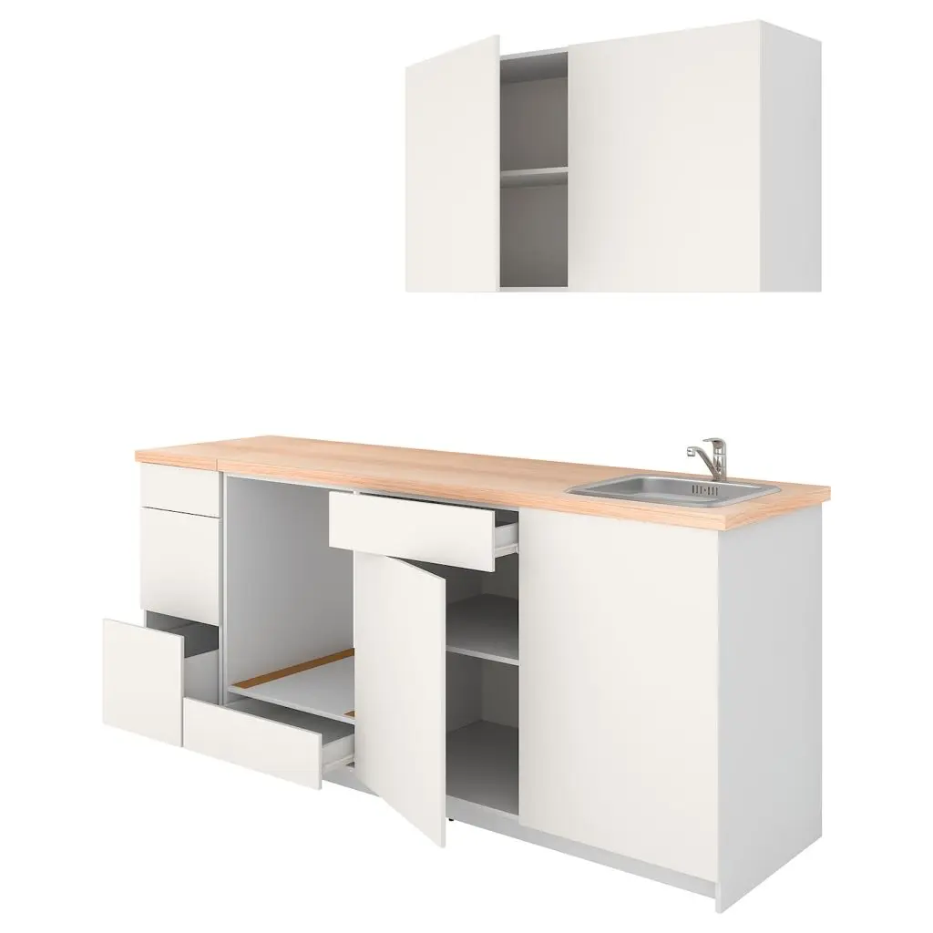 Вы можете выбрать готовую комбинацию или создать индивидуальное решение, комбинируя модули КНОКСХУЛЬТ.Отличное бюджетное решение для кухни среднего размера с отдельно стоящей плитой.Удобно хранить кухонную и столовую посуду, так как в комбинации есть модули с ящиками и полками.Пространство стены используется эффективно благодаря дополнительному месту для хранения в шкафу над вытяжкой.Выберите отдельно стоящую плиту и встраиваемую вытяжку и дополните мебель понравившимися ручками, чтобы придать решению более индивидуальный вид.Меламиновая поверхность фасадов и каркасов проста в уходе и устойчива к появлению царапин.Устойчивая к воздействию влаги, тепла и появлению царапин ламинированная столешница проста в уходе.Дверцы легко установить благодаря регулируемым по высоте, глубине и ширине петлям.Дверцы можно установить справа или слева.Регулируемые ножки обеспечивают устойчивость даже на неровном полу.Включено: шкаф, дверцы, ящики, столешница, ножки, цоколь, полки, петли и крепления.Ручки продаются отдельно.Бытовая техника продается отдельно.Кухонный смеситель продается отдельно.Для разных стен требуются различные крепежные приспособления. Подберите подходящие для ваших стен шурупы, дюбели, саморезы и т. п. (не прилагаются).Чтобы сохранить ламинированную столешницу, никогда не режьте непосредственно на ее поверхности, пользуйтесь разделочной доской. Предметы с острыми краями могут повредить поверхность.Можно дополнить ковриком для ящика и поддонами, чтобы защитить поверхность от царапин, которые могут оставить тяжелые сковороды и кастрюли.