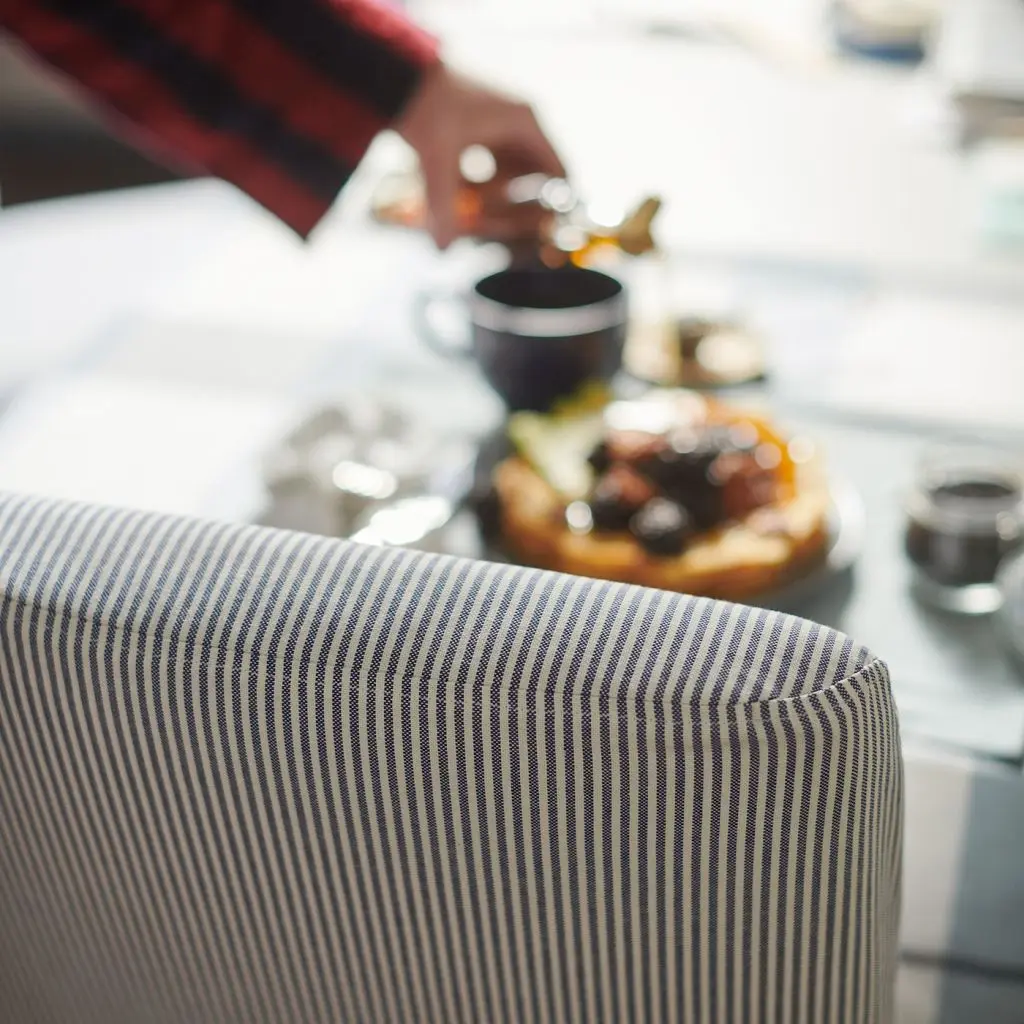 Обивка стула состоит из прямых волокон полиэстера, между которыми есть небольшие промежутки. Так обеспечивается комфорт, эластичность и хорошая вентиляция, поэтому сидеть на стуле удобно и не жарко.