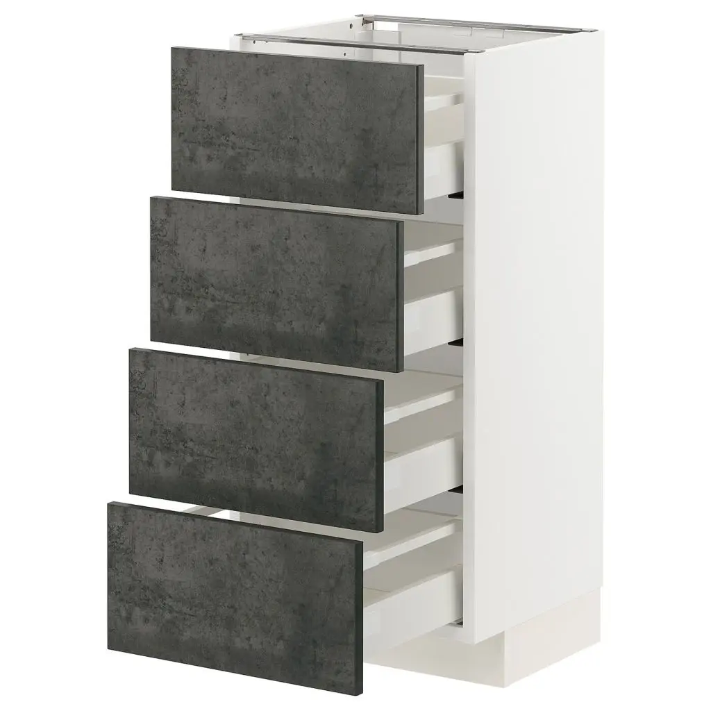 Код кухонного шкафа ME/MA 472Благодаря доводчику ящики закрываются плавно, мягко и бесшумно.Ящики выдвигаются полностью, что обеспечивает удобный обзор и доступ к содержимому.Ящики с плавным ходом и стопором.Самозакрывающиеся ящики.Каркас имеет устойчивую конструкцию благодаря стенкам из ДСП толщиной 18 мм.Для разных стен требуются различные крепежные приспособления. Подберите подходящие для ваших стен шурупы, дюбели, саморезы и т. п. (не прилагаются).Ножки и цоколи продаются отдельно.Можно дополнить ручкой.Дизайнер