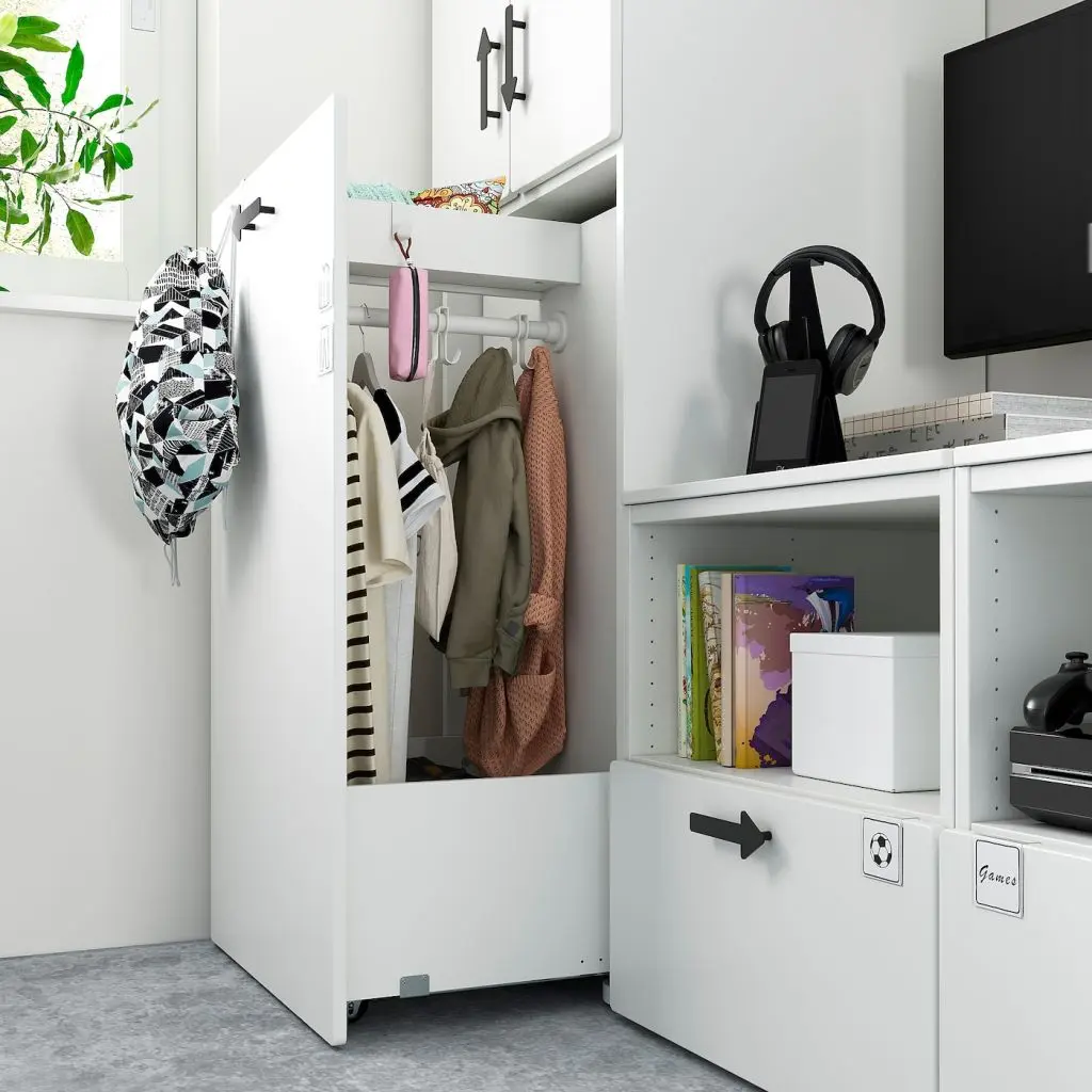 Такое решение дает вам много места для хранения и освобождает пространство для экрана или доски для записей на стене.Ваш ребенок сможет много лет пользоваться этим решением для хранения, так как по мере изменения потребностей вы можете менять внутреннее оснащение.В нижней части выдвижного модуля можно хранить все, что нужно быстро убирать с глаз долой.Благодаря крючкам изнутри и снаружи ребенку будет гораздо проще развешивать одежду, рюкзаки и другие вещи, которые обычно просто валяются на полу.Двери с петлями для плавного закрывания всегда закрываются бесшумно — даже в разгар жаркого спора.ВНИМАНИЕ! ОПАСНОСТЬ ОПРОКИДЫВАНИЯ! Незакрепленная мебель может опрокинуться. Эту мебель необходимо крепить к стене с помощью прилагаемого крепежа для предотвращения опрокидывания.Для разных стен требуются различные крепежные приспособления. Подберите подходящие для ваших стен шурупы, дюбели, саморезы и т. п. (не прилагаются).Можно дополнить ручками.Ручки продаются отдельно.