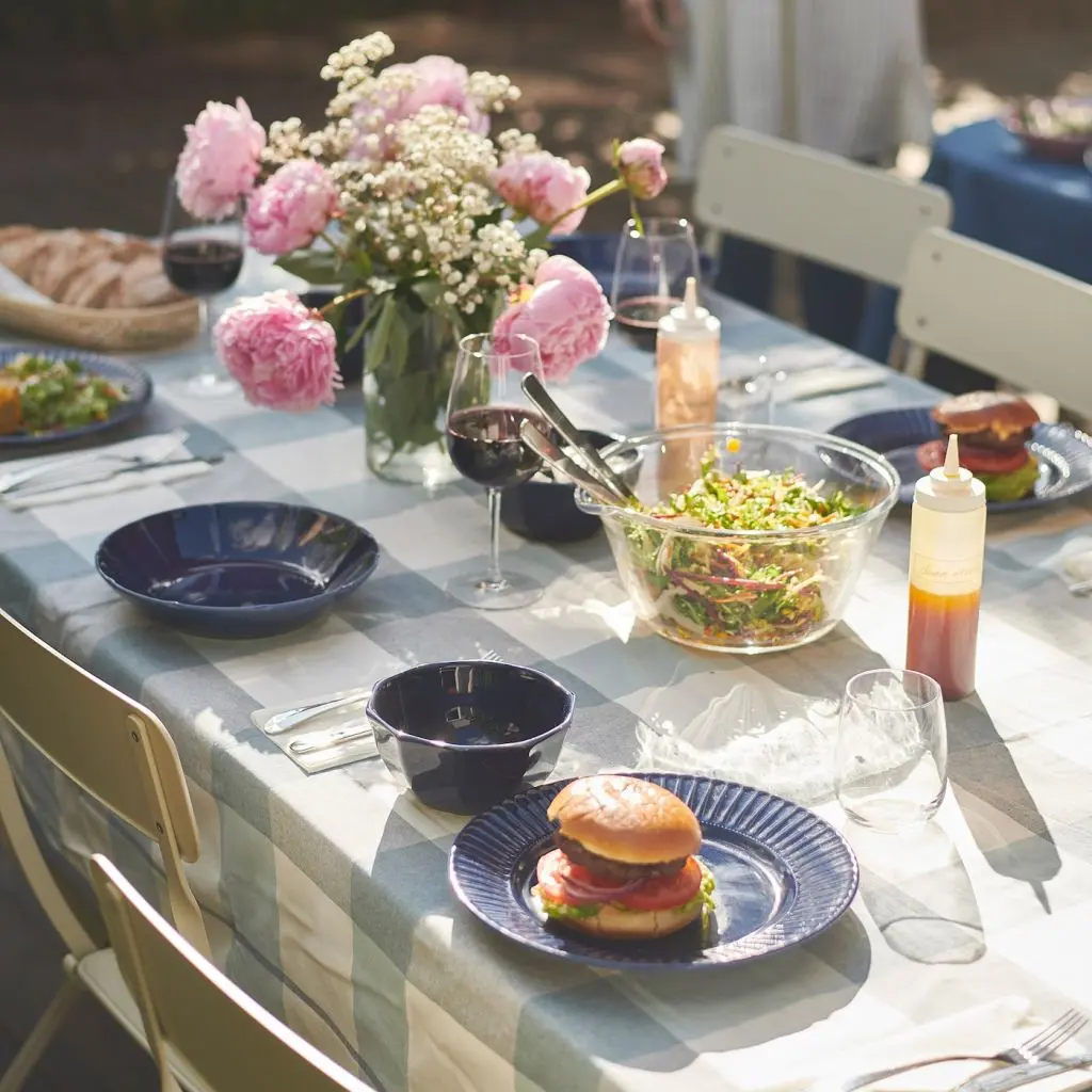 Скатерть защищает поверхность стола и подчеркивает красоту сервировки.Крашенный в пряже хлопок, поэтому после стирки цвета не блекнут.Подходит для столов на 4-6 человек.Дизайнер