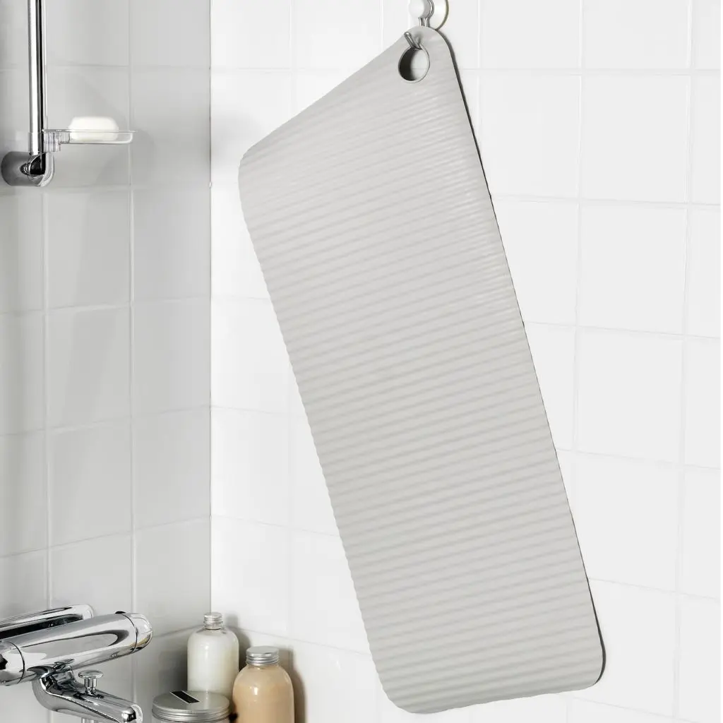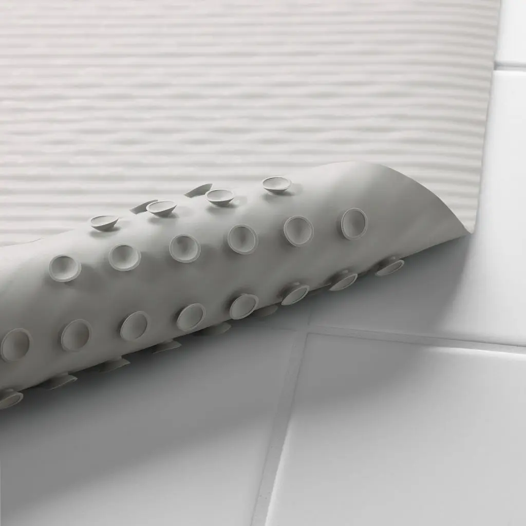 Не скользит в ванне или душевой кабине благодаря присоскам.После каждого использования рекомендуется провесить коврик для просушки. Для этого в коврике есть отверстие.Дизайнер