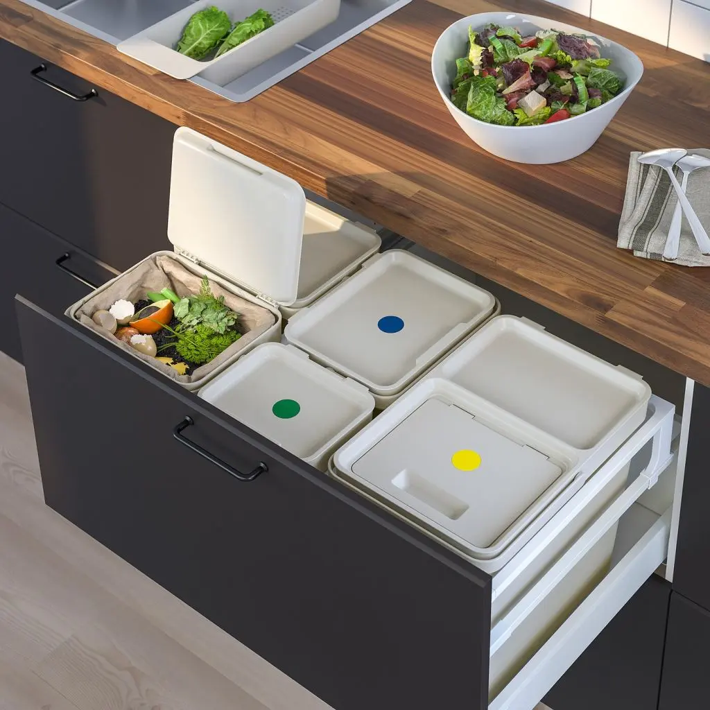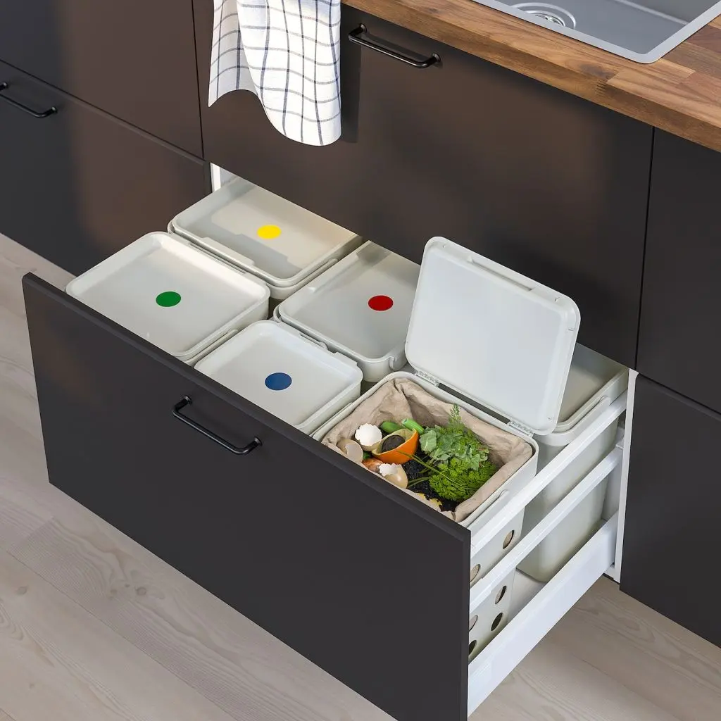 Ящик с нажимным механизмом для тех, кто мечтает о минималистичной кухне без ручек на поверхности фасадов. Такой ящик вы без труда откроете, даже если у вас заняты руки. Достаточно просто слегка нажать на него коленом, и он откроется плавно и бесшумно.