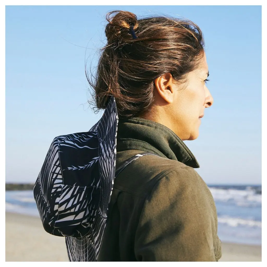 Эта черно-белая шляпа будет защищать голову, лицо и шею от солнечных лучей. Идеальный вариант для пляжа или похода. Даже если шляпа упадет в воду, ткань очень быстро высохнет.