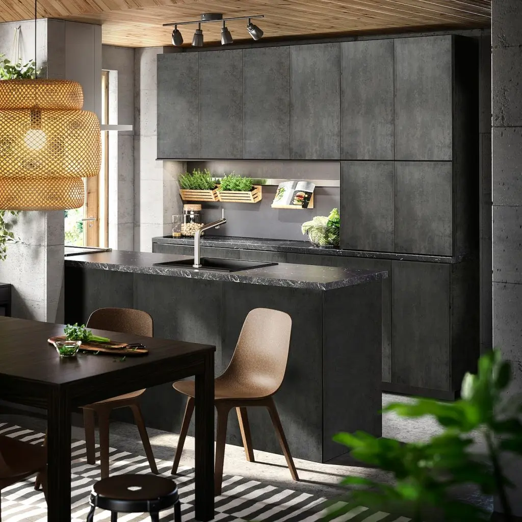 Темно-серые фасады КАЛЬХЮТТАН подчеркнут современный урбанистический стиль вашей кухни. Поверхность под бетон придает мебели выразительность и подчеркивает актуальный индустриальный дизайн.