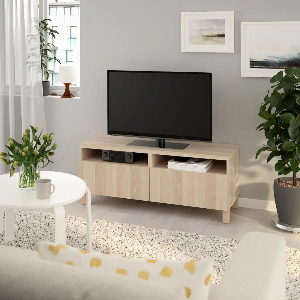 Благодаря доводчикам ящики закрываются плавно и бесшумно.Благодаря нескольким отверстиям на задней панели тумбы под ТВ провода от телевизора и других устройств всегда будут под рукой, но не на виду.Два ящика обеспечат порядок в хранении пультов, игровых приставок и других аксессуаров для ТВ.Ножки придают комбинации БЕСТО более легкий вид, поднимая модули на полом. Кроме того, это упрощает уборку.Специальное отверстие в верхней панели обеспечит удобное и компактное размещение проводов.Эту мебель необходимо крепить к стене с помощью прилагаемого стенного крепежа.Макс. нагрузка на верхнюю панель этой тумбы под ТВ: 50 кг.Для разных стен требуются различные крепежные приспособления. Подберите подходящие для ваших стен шурупы, дюбели, саморезы и т. п. (не прилагаются).Внутренние элементы для организации хранения в модулях БЕСТО продаются отдельно.Если вы выберете функцию плавного закрывания, рекомендуем дополнить фасады ручками, чтобы открывать ящики/шкафы было удобнее.Дизайнер