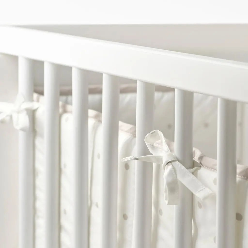 Благодаря мягкому бортику малыш не ударится о перекладины боковин кроватки. Застежки надежно фиксируют бортик в кроватке.