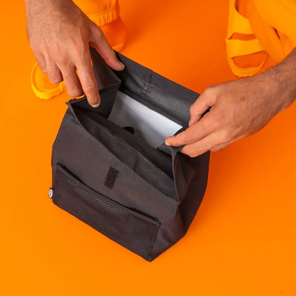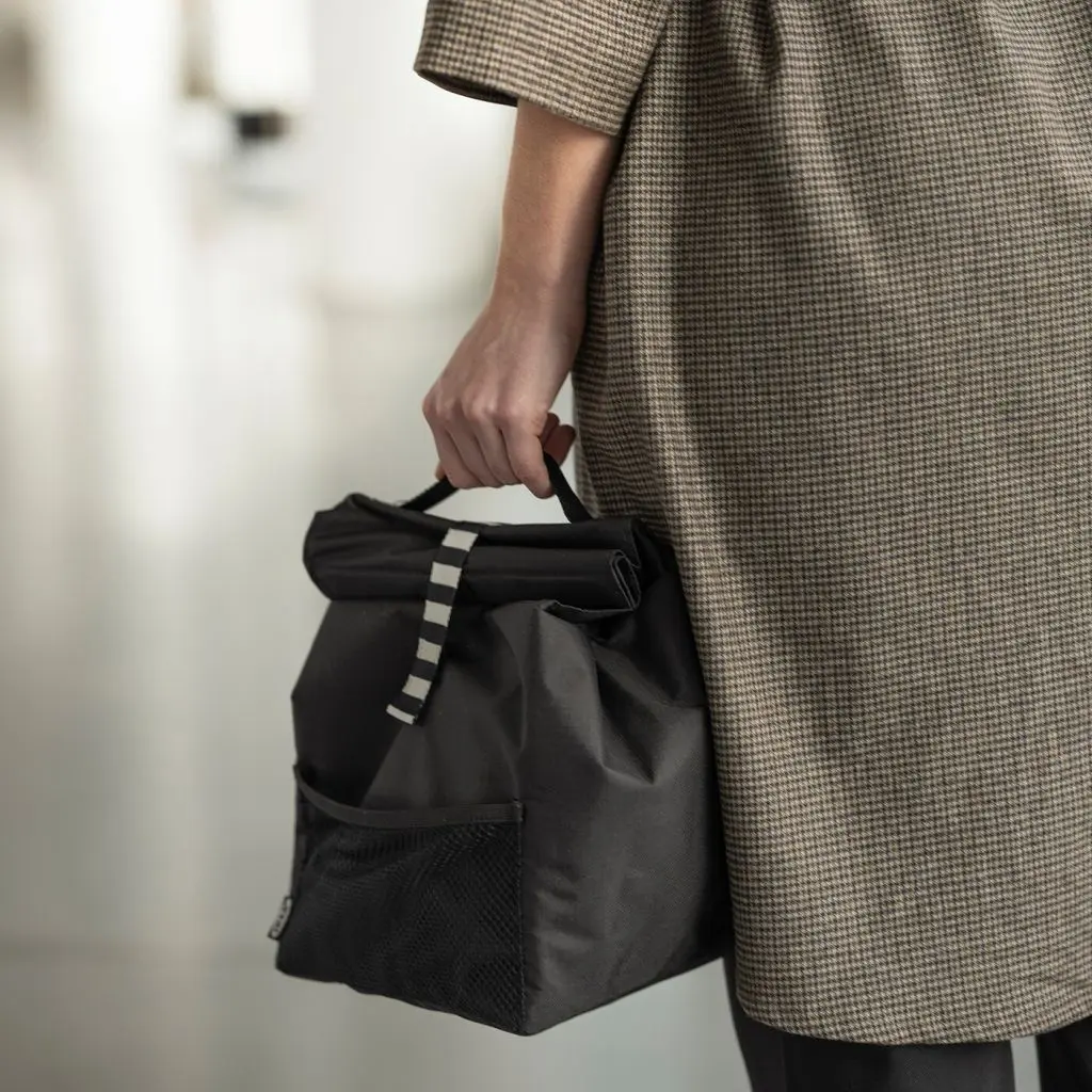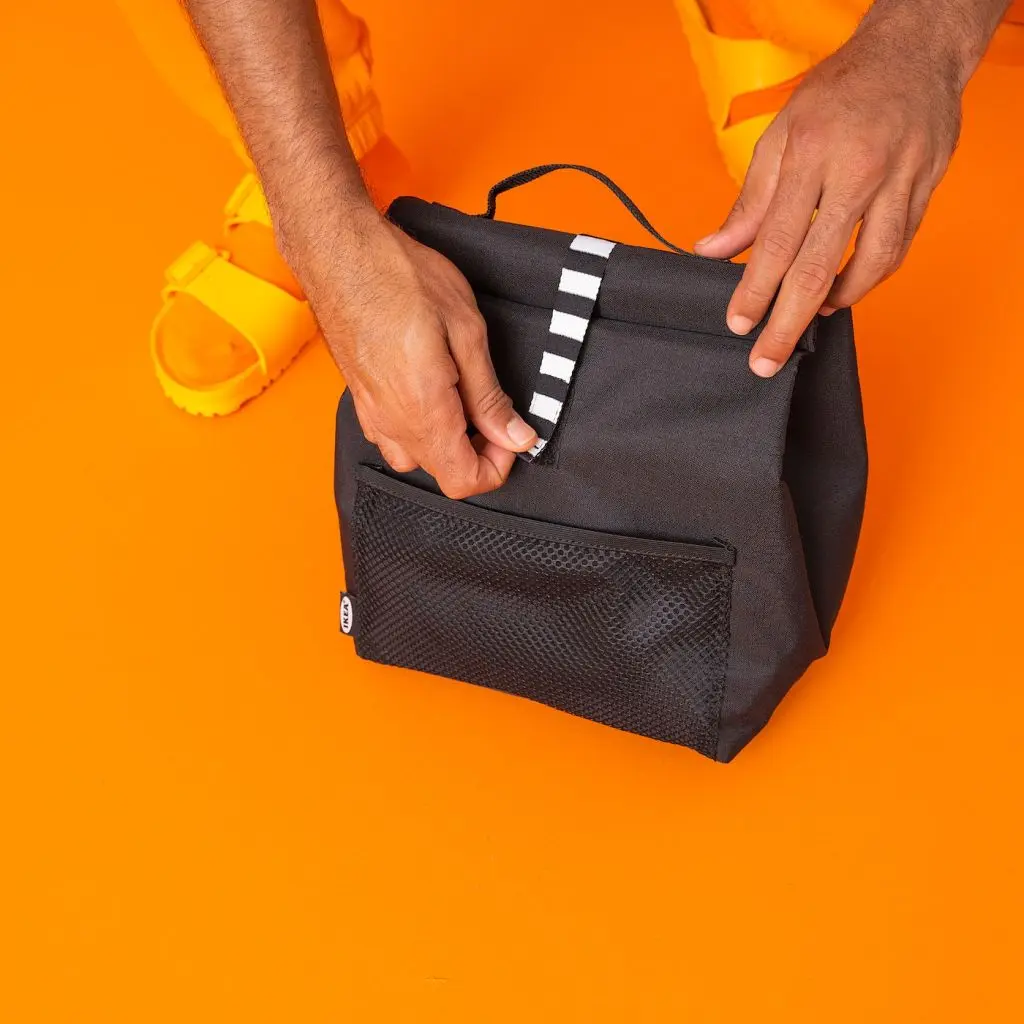 Эта компактная черная сумка для завтраков удобна в любой в ситуации благодаря лаконичному дизайну и продуманным деталям: теплоизолирующему внутреннему слою, чтобы еда дольше оставалась теплой, водонепроницаемому материалу и карману для столовых приборов.