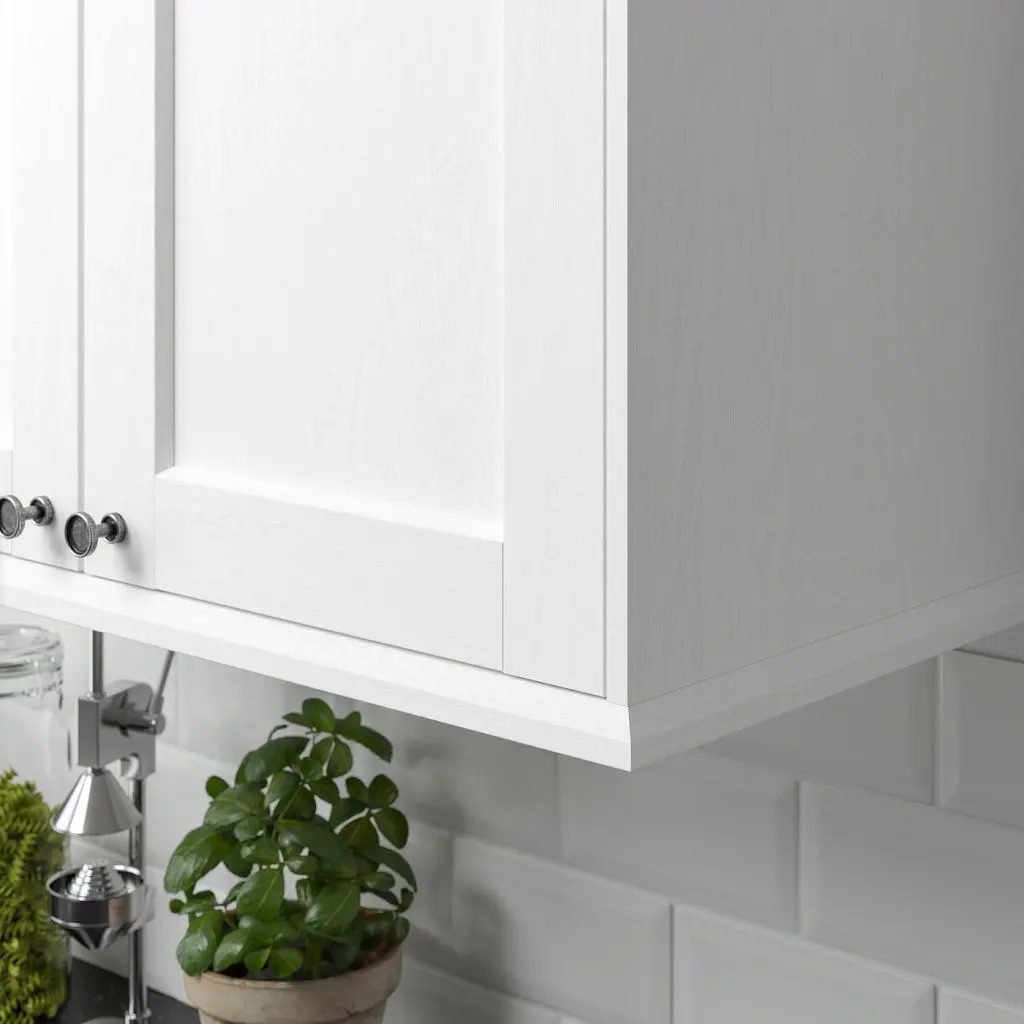 Можно использовать как декоративный карниз под навесными шкафами, чтобы спрятать подсветку, провода и розетки, а также установить на верхний край навесных и высоких шкафов.