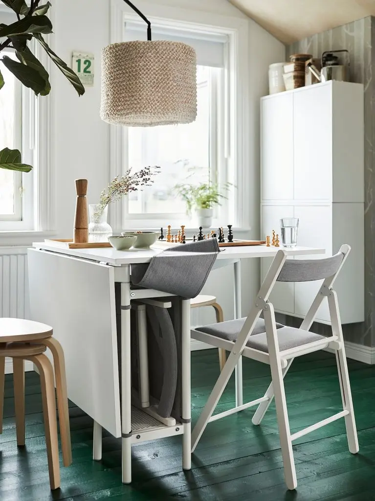 Во вместительном отделении под столешницей достаточно места даже для двух складных стульев (например, ТЕРЬЕ, ГУНДЕ и НИССЕ), которые вы сможете быстро достать, если неожиданно нагрянут гости.