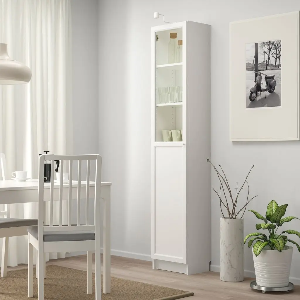 Дверцы со стеклянной вставкой обеспечивают защиту содержимого от пыли и позволяют Вам продемонстрировать вещи или спрятать их от посторонних глаз.Съемные полки; устанавливайте на разном уровне в соответствии с необходимостью.Конструкция петель позволяет отрегулировать и выровнять дверцу по вертикали и по горизонтали. Эту мебель необходимо крепить к стене с помощью прилагаемого стенного крепежа.Будьте осторожны при обращении со стеклом! Из-за поврежденных краев и царапин на поверхности стекло может внезапно треснуть и/или разбиться. Избегайте ударов сбоку, там стекло наиболее уязвимо.Для разных стен требуются различные крепежные приспособления. Подберите подходящие для ваших стен шурупы, дюбели, саморезы и т. п. (не прилагаются).Требуемая мин. высота потолка: 205 см.1 несъемная и 4 съемные полки прилагаются.Для расширения площади хранения дополните верхней полкой БИЛЛИ такой же ширины.