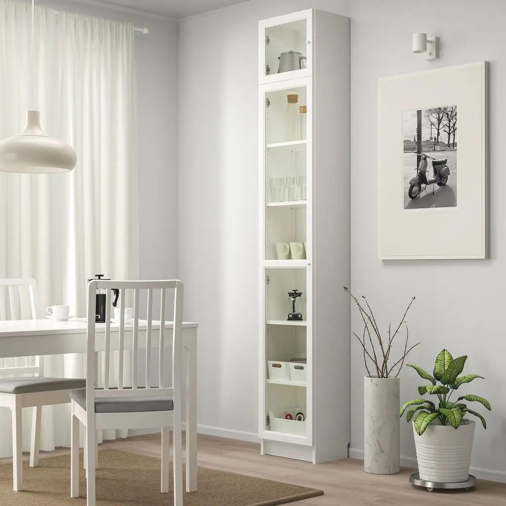 Стеллаж снабжен дополнительной верхней полкой: вы можете максимально задействовать поверхность стены.Съемные полки; устанавливайте на разном уровне в соответствии с необходимостью.Конструкция петель позволяет отрегулировать и выровнять дверцу по вертикали и по горизонтали. Стеклянные дверцы защищают любимые вещи от пыли.Эту мебель необходимо крепить к стене с помощью прилагаемого стенного крепежа.Будьте осторожны при обращении со стеклом! Из-за поврежденных краев и царапин на поверхности стекло может внезапно треснуть и/или разбиться. Избегайте ударов сбоку, там стекло наиболее уязвимо.Для разных стен требуются различные крепежные приспособления. Подберите подходящие для ваших стен шурупы, дюбели, саморезы и т. п. (не прилагаются).Требуемая минимальная высота потолка для сборки в горизонтальном положении – 244 см, в вертикальном – 242 см.1 несъемная и 4 съемные полки прилагаются.Дизайнер