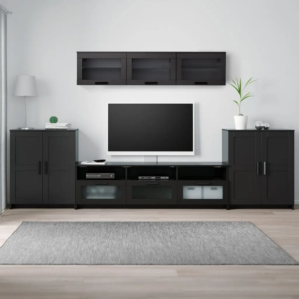 Эта комбинация для ТВ предоставит достаточно места для хранения, чтоб в вашей гостиной царил идеальный порядок.Глухие дверцы защитят содержимое от пыли.Отверстия для проводов на задней панели. Провода не на виду, но всегда под рукой.Ящики с плавным ходом и стопором.Эту мебель необходимо крепить к стене с помощью прилагаемого стенного крепежа.Для разных стен требуются различные крепежные приспособления. Подберите подходящие для ваших стен шурупы, дюбели, саморезы и т. п. (не прилагаются).Комбинируется с другой мебелью серии БРИМНЭС.Дизайнер
