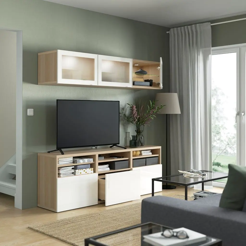 Благодаря нескольким отверстиям на задней панели тумбы под ТВ провода от телевизора и других устройств всегда будут под рукой, но не на виду.Специальное отверстие в верхней панели обеспечит удобное и компактное размещение проводов.Благодаря интегрированному нажимному механизму ящик открывается легким нажатием.Съемные полки позволяют регулировать пространство.Настенные шкафчики позволяют эффективно использовать пространство над телевизором.Организуйте и оптимизируйте систему для хранения БЕСТО, используя подходящие коробки и вставки.Максимальная нагрузка на закрепленный на стене каркас зависит от материала стены.Эту мебель необходимо крепить к стене с помощью прилагаемого стенного крепежа.Будьте осторожны при обращении с закаленным стеклом! Из-за поврежденных краев и царапин на поверхности стекло может внезапно разбиться.Для функционирования нажимного механизма необходимо пространство между каркасом и фронтальной панелью ящика, чтобы ящик открывался нажатием. Небольшой зазор необходим для обеспечения этой функции и не является недостатком товара.Чтобы создать единый интерьер во всем доме, фасады СЕЛЬСВИКЕН можно комбинировать с подходящими дверями ФАРДАЛЬ для гардероба ПАКС.