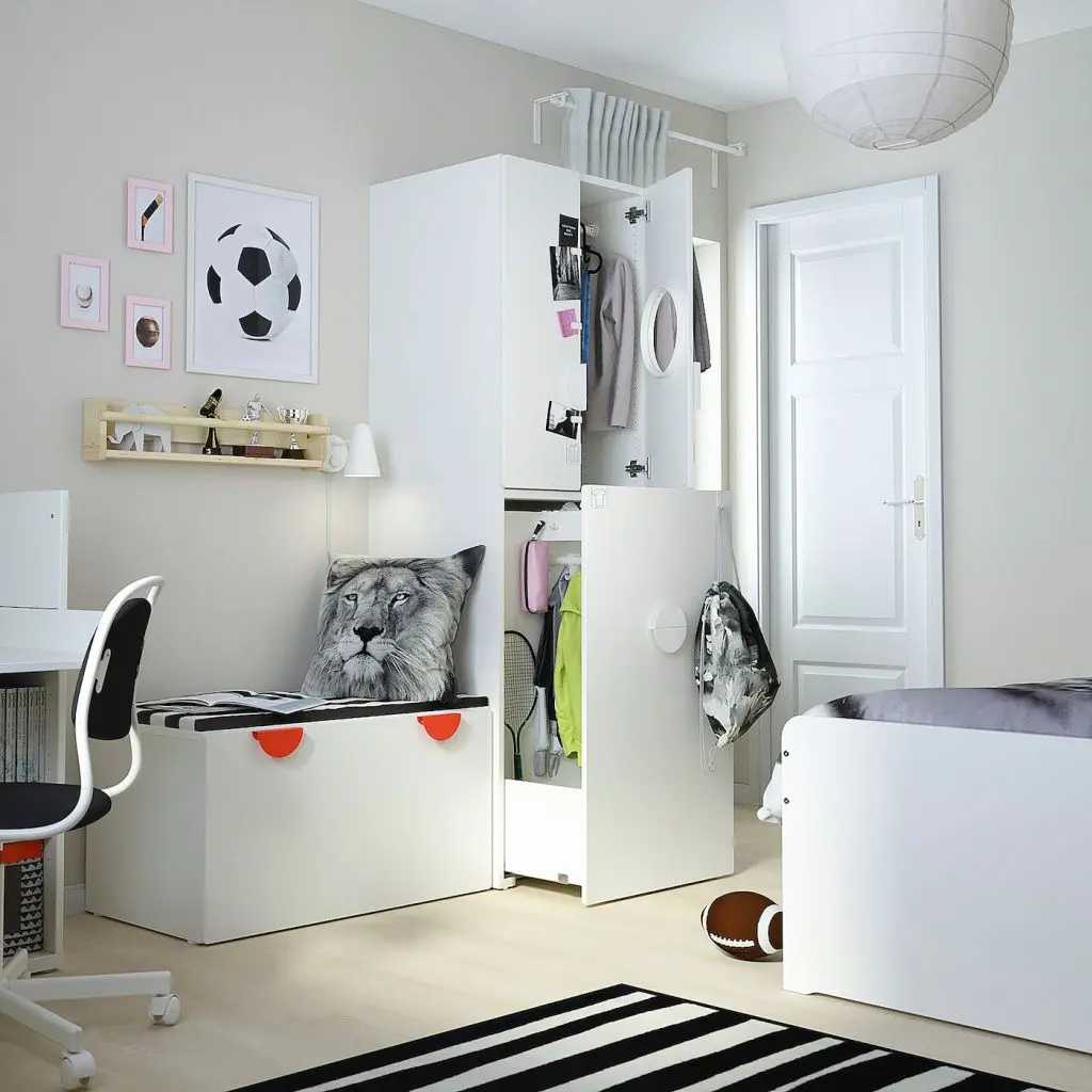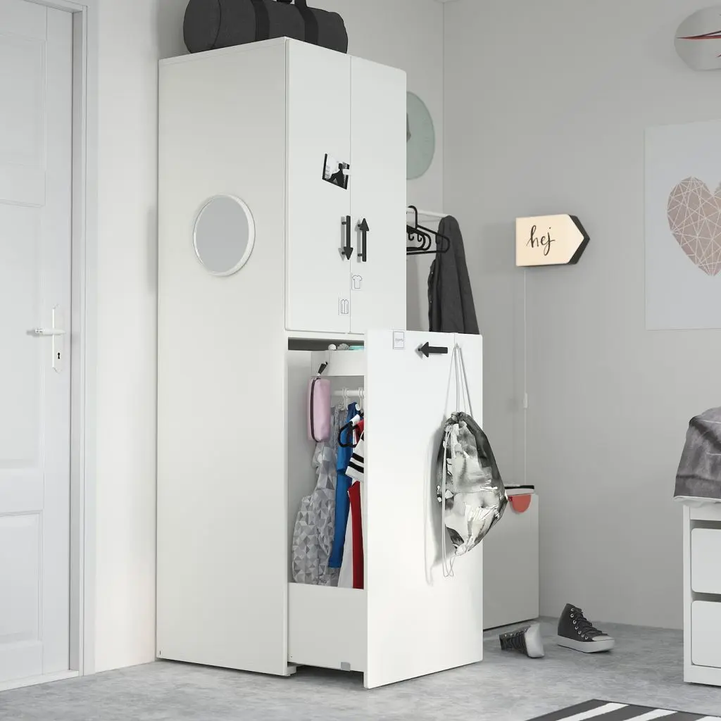 Для безопасности как детей, так и взрослых все дверцы системы СМОСТАД имеют скругленные углы.Благодаря крючкам изнутри и снаружи ребенку будет гораздо проще развешивать одежду, рюкзаки и другие вещи, которые обычно просто валяются на полу.В нижней части выдвижного модуля можно хранить все, что нужно быстро убирать с глаз долой.Двери, петли и платяная штанга прилагаются.2 крючка для платяной штанги ХЭЛПА и 4 крючка/зажима ЛЭТТХЕТ прилагаются.ВНИМАНИЕ! ОПАСНОСТЬ ОПРОКИДЫВАНИЯ! Незакрепленная мебель может опрокинуться. Эту мебель необходимо крепить к стене с помощью прилагаемого крепежа для предотвращения опрокидывания.Для сборки этой мебели требуются два человека.Для разных стен требуются различные стенные крепления. Прилагающиеся шурупы пригодны для дерева, а дюбели можно использовать для гипсокартона/штукатурки, бетона или кирпичной кладки. Руководствуйтесь инструкциями по работе с материалом ваших стен.Для организации внутреннего пространства дополните аксессуарами ХЭНГИГ, полками и проволочными корзинами ХЭЛПА и коробками УППРЮМД. Продаются отдельно.Ручки продаются отдельно.