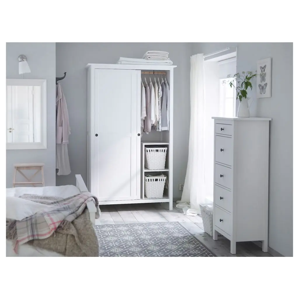 Натуральная красота из массива дерева, произведенного с заботой о людях и природе. Традиционный стиль и современные преимущества, такие как раздвижные дверцы, не требующие дополнительного места для открывания. Внимание: мебель необходимо крепить к стене.