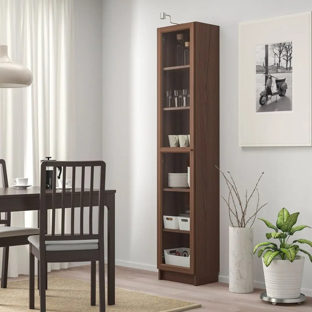 Стеклянные дверцы защищают любимые вещи от пыли.Съемные полки; устанавливайте на разном уровне в соответствии с необходимостью.Отделка из шпона. Конструкция петель позволяет отрегулировать и выровнять дверцу по вертикали и по горизонтали. Эту мебель необходимо крепить к стене с помощью прилагаемого стенного крепежа.Будьте осторожны при обращении со стеклом! Из-за поврежденных краев и царапин на поверхности стекло может внезапно треснуть и/или разбиться. Избегайте ударов сбоку, там стекло наиболее уязвимо.Для разных стен требуются различные крепежные приспособления. Подберите подходящие для ваших стен шурупы, дюбели, саморезы и т. п. (не прилагаются).Требуемая мин. высота потолка: 205 см.1 несъемная и 4 съемные полки прилагаются.Для расширения площади хранения дополните верхней полкой БИЛЛИ такой же ширины.Можно дополнить угловым креплением БИЛЛИ, чтобы построить удобный угловой модуль.Можно установить на угловой модуль, только если полка, находящаяся рядом с ним, без дверец.Дверь не подходит для стеллажей, которые были приобретены весной 2014 года или раньше.Дизайнер