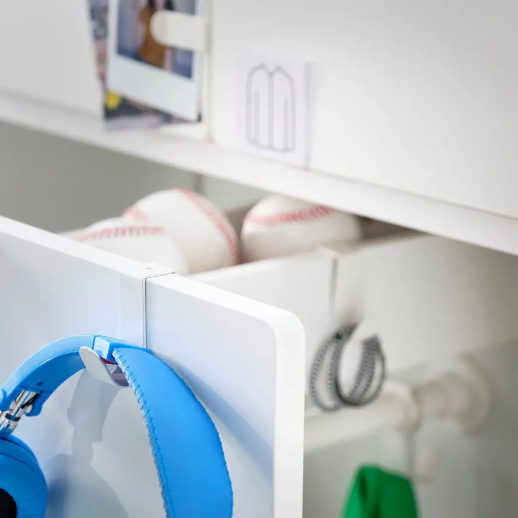 Создавая этот модуль с выдвижным ящиком, мы старались смотреть на мир глазами ребенка. Ящик обеспечивает полный обзор содержимого, а вещи из него можно доставать с двух сторон: удобно как совсем малышам, так и детям постарше.