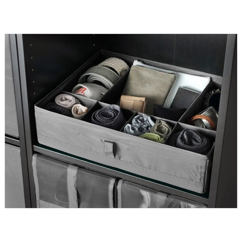 Ткань изготовлена из переработанного полиэстера. Использование переработанных материалов делает нас еще на шаг ближе к более экологичному будущему.Носки, ремни, украшения и т.п. будут всегда в порядке в комоде или гардеробе.Ящик удобно выдвигать, так как ручки есть и с короткой, и с длинной стороны.Когда коробка вам не нужна, ее можно сложить. Для этого нужно открыть молнию на дне коробки.Подходит для гардероба ПАКС глубиной 35 см и модуля для хранения СКУББ с 6 отделениями.Дизайнер
